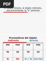Cuando el objeto directo es una persona: I know you. Te conozco. She loves him. Ella lo ama. She loves me. Ella me ama. Juan sees her. Juan la ve. They call us. Ellos nos llaman. We call them. Los llamamos. La colocacin del pronombre El pronombre de objeto directo se coloca: antes de: un verbo conjugado un mandato negativo unido a: un mandato afirmativo antes o despus de: un infinitivo un gerundio Ejemplos: Has visto mi libro? Lo dej aqu. Esas plantas son venenosas! No las toquis! Cmanlos ahora mismo! (los guisantes) Seguro que ella va a escribirla maana. (la carta) Ellos estaban terminndolo cuando llegamos.(el trabajo) Lo quiero ver. Quiero verlo. I want to see it. Lo debemos comprar. Debemos comprarlo. We should buy it. Mara nos debe visitar. Mara debe visitarnos. Mary should visit us. Juan lo necesita lavar. Juan necesita lavarlo. John needs to wash it.