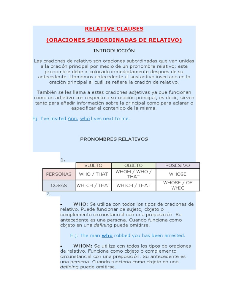 INTRODUCCIN Las oraciones de relativo son oraciones subordinadas que van unidas a la oracin principal por medio de un pronombre relativo; este pronombre debe ir colocado inmediatamente despus de su antecedente. Llamamos antecedente al sustantivo insertado en la oracin principal al cul se refiere la oracin de relativo. Tambin se les llama a estas oraciones adjetivas ya que funcionan como un adjetivo con respecto a su oracin principal, es decir, sirven tanto para aadir informacin sobre la principal como para aclarar o especificar el contenido de la misma. Ej. I've invited Ann, who lives next to me.