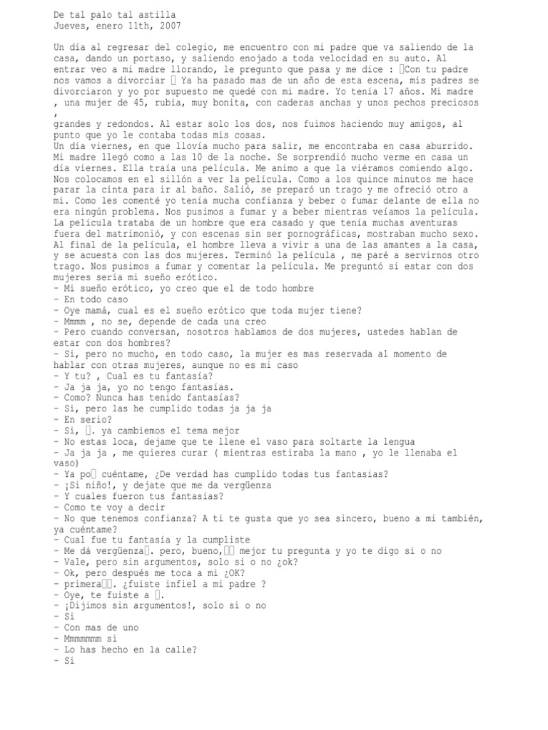 va saliendo de la casa, dando un portaso, y saliendo enojado a toda velocidad en su auto. Al entrar veo a mi madre llorando, le pregunto que pasa y me dice : Con tu padre nos vamos a divorciar Ya ha pasado mas de un ao de esta escena, mis padres se divorciaron y yo por supuesto me qued con mi madre. Yo tena 17 aos. Mi madre , una mujer de 45, rubia, muy bonita, con caderas anchas y unos pechos preciosos , grandes y redondos. Al estar solo los dos, nos fuimos haciendo muy amigos, al punto que yo le contaba todas mis cosas. Un da viernes, en que llova mucho para salir, me encontraba en casa aburrido. Mi madre lleg como a las 10 de la noche. Se sorprendi mucho verme en casa un da viernes. Ella traa una pelcula. Me animo a que la viramos comiendo algo. Nos colocamos en el silln a ver la pelcula. Como a los quince minutos me hace parar la cinta para ir al bao. Sali, se prepar un trago y me ofreci otro a mi. Como les coment yo tena mucha confianza y beber o fumar delante de ella no era ningn problema. Nos pusimos a fumar y a beber mientras veamos la pelcula. La pelcula trataba de un hombre que era casado y que tena muchas aventuras fuera del matrimoni, y con escenas sin ser pornogrficas, mostraban mucho sexo. Al final de la pelcula, el hombre lleva a vivir a una de las amantes a la casa, y se acuesta con las dos mujeres. Termin la pelcula , me par a servirnos otro trago. Nos pusimos a fumar y comentar la pelcula. Me pregunt si estar con dos mujeres sera mi sueo ertico. - Mi sueo ertico, yo creo que el de todo hombre - En todo caso - Oye mam, cual es el sueo ertico que toda mujer tiene? - Mmmm , no se, depende de cada una creo - Pero cuando conversan, nosotros hablamos de dos mujeres, ustedes hablan de estar con dos hombres? - Si, pero no mucho, en todo caso, la mujer es mas reservada al momento de hablar con otras mujeres, aunque no es mi caso - Y tu? , Cual es tu fantasa? - Ja ja ja, yo no tengo fantasas. - Como? Nunca has tenido fantasas? - Si, pero las he cumplido todas ja ja ja - En serio? - Si, . ya cambiemos el tema mejor - No estas loca, dejame que te llene el vaso para soltarte la lengua - Ja ja ja , me quieres curar ( mientras estiraba la mano , yo le llenaba el vaso) - Ya po cuntame, De verdad has cumplido todas tus fantasias? - Si nio!, y dejate que me da vergenza - Y cuales fueron tus fantasas? - Como te voy a decir - No que tenemos confianza? A ti te gusta que yo sea sincero, bueno a mi tambin, ya cuntame? - Cual fue tu fantasa y la cumpliste - Me d vergenza . pero, bueno, mejor tu pregunta y yo te digo si o no - Vale, pero sin argumentos, solo si o no ok? - Ok, pero despus me toca a mi OK? - primera . fuiste infiel a mi padre ? - Oye, te fuiste a . - Dijimos sin argumentos!, solo si o no - Si - Con mas de uno - Mmmmmmm si - Lo has hecho en la calle? - Si