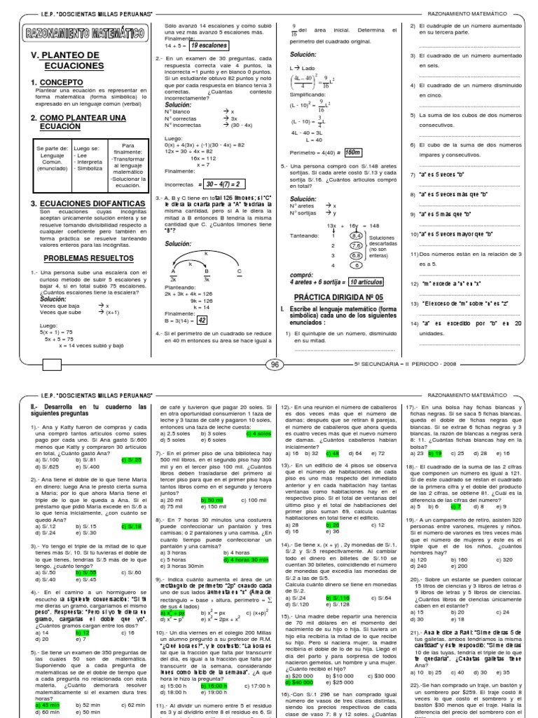 I.E.P. DOSCIENTAS MILLAS PERUANAS II.- Desarrolla en tu siguientes preguntas cuaderno las de caf y tuvieron que pagar 20 soles. Si en otra oportunidad consumieron 1 taza de leche y 3 tazas de caf y pagaron 10 soles, entonces una taza de leche cuesta: a) 2,5 soles b) 3 soles c) 4 soles d) 5 soles e) 6 soles 7).- En el primer piso de una biblioteca hay 500 mil libros, en el segundo piso hay 300 mil y en el tercer piso 100 mil. Cuntos libros deben trasladarse del primero al tercer piso para que en el primer piso haya tantos libros como en el segundo y tercero juntos? a) 20 mil b) 50 mil c) 100 mil d) 75 mil e) 150 mil 8).- En 7 horas 30 minutos una costurera puede confeccionar un pantaln y tres camisas; 2 pantalones y una camisa. En cunto tiempo puede confeccionar un pantaln y una camisa? a) 3 horas b) 4 horas c) 5 horas d) 4 horas 30 min e) 3 horas 30min 9).- Indica cunto aumenta el rea de un rectngulo de permetro 2p cuando cada uno de sus lados aumenta en x (rea de rectngulo = base x altura, permetro = de sus 4 lados) 2 2 2 a) x + px b) x px c) (x+p) 2 2 2 2 d) x p e) x 2px + x 10).- Un da viernes en el colegio 200 Millas un alumno pregunt a su profesor de R.M. Qu hora es?, y le contest: La hora es tal que la fraccin que falta por transcurrir del da, es igual a la fraccin que falta por transcurrir de la semana, considerando lunes como inicio de la semana. A qu hora le hizo la pregunta? a) 15:00 h b) 16:00 h c) 17:00 h d) 18:00 h e) 19:00 h 11).- Al dividir un nmero entre 5 el residuo es 3 y al dividirlo entre 8 el residuo es 6. Si los cocientes se diferencian en 9, qu resto dar al dividir el nmero por 7? a) 6 b) 3 c) 1 d) 5 e) 2 12).- En una reunin el nmero de caballeros es dos veces ms que el nmero de damas; despus que se retiran 8 parejas, el nmero de caballeros que ahora queda es cuatro veces ms que el nuevo nmero de damas. Cuntos caballeros haban inicialmente? a) 16 b) 32 c) 48 d) 64 e) 72 13).- En un edificio de 4 pisos se observa que el nmero de habitaciones de cada piso es uno ms respecto del inmediato anterior y en cada habitacin hay tantas ventanas como habitaciones hay en el respectivo piso. Si el total de ventanas del ltimo piso y el total de habitaciones del primer piso suman 69, calcula cuntas habitaciones en total tiene el edificio. a) 28 b) 26 c) 12 d) 16 e) 36 14).- Se tiene x, (x + y) , 2y monedas de S/.1, S/.2 y S/.5 respectivamente. Al cambiar todo el dinero en billetes de S/.10 se cuentan 30 billetes, coincidiendo el nmero de monedas que exceda las monedas de S/.2 a las de S/5. Calcula cunto dinero se tiene en monedas de S/.2. a) S/.24 b) S/.116 c) S/.64 d) S/.120 e) S/.128 15).- Una madre debe repartir una herencia de 70 mil dlares en el momento del nacimiento de su hijo o hija. Si tuviera un hijo ella recibira la mitad de lo que recibe su hijo. Pero si naciera mujer, la madre recibira el doble de lo de su hija. Lleg el da del parto y para sorpresa de todos nacieron gemelos, un hombre y una mujer. Cunto recibi el hijo? a) $20 000 b) $10 000 c) $30 000 d) $40 000 e) $25 000 16).-Con S/.1 296 se han comprado igual nmero de vasos de tres clases distintas, siendo los precios respectivos de cada clase de vaso 7; 8 y 12 soles. Cuntas docenas de vasos se compraron? a) 4 b) 6 c) 8 d) 10 e) 12