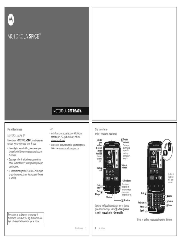 Presentamos el MOTOROLA SPICE: mantngase en contacto con su entorno y al tanto de todo. Use widgets personalizables, para que siempre tenga el control de los mensajes y actualizaciones que reciba. Descargue miles de aplicaciones sorprendentes desde Android Market para reproducir y navegar cuanto desee. El teclado de navegacin BACKTRACK (touchpad) proporciona navegacin sin obstculos sin bloquear la pantalla.