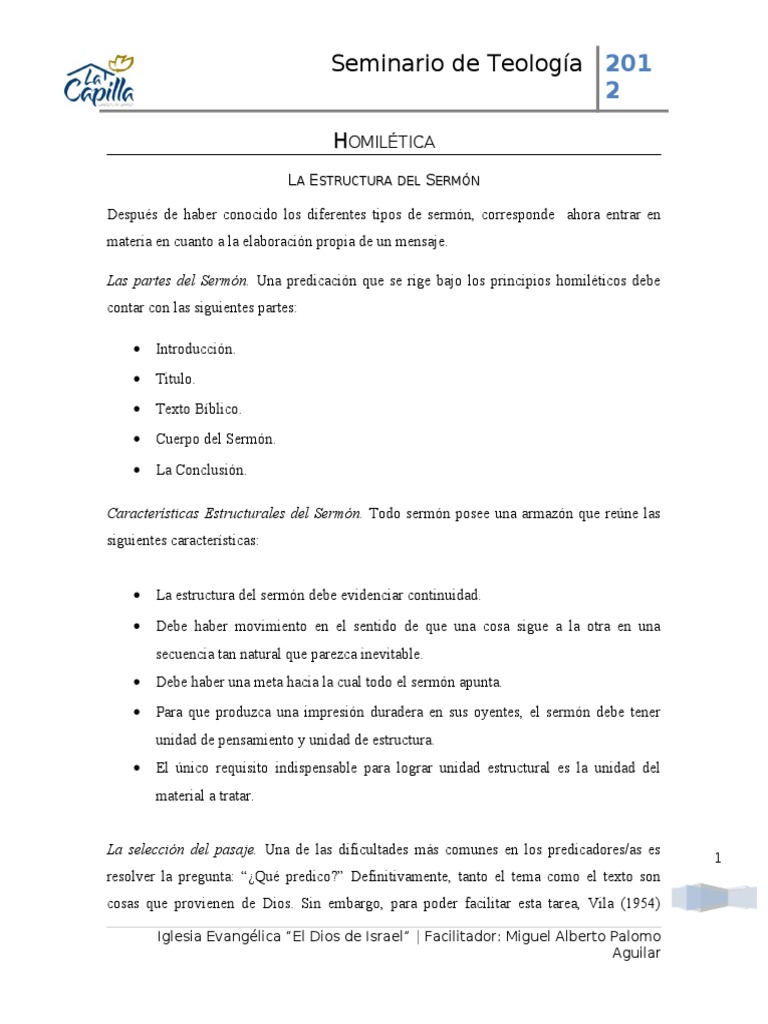 Caractersticas Estructurales del Sermn. Todo sermn posee una armazn que rene las siguientes caractersticas: La estructura del sermn debe evidenciar continuidad. Debe haber movimiento en el sentido de que una cosa sigue a la otra en una secuencia tan natural que parezca inevitable. Debe haber una meta hacia la cual todo el sermn apunta. Para que produzca una impresin duradera en sus oyentes, el sermn debe tener unidad de pensamiento y unidad de estructura. El nico requisito indispensable para lograr unidad estructural es la unidad del material a tratar. La seleccin del pasaje. Una de las dificultades ms comunes en los predicadores/as es resolver la pregunta: Qu predico? Definitivamente, tanto el tema como el texto son cosas que provienen de Dios. Sin embargo, para poder facilitar esta tarea, Vila (1954)