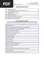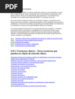 Eje I Trastornos clnicos Otros problemas que pueden ser objeto de atencin clnica Trastornos de inicio en la infancia, la niez o la adolescencia (se excluye el retraso mental, que se diagnostica en el Eje II) Delirium, demencia, trastornos amnsicos y otros trastornos cognoscitivos Trastornos mentales debidos a una enfermedad mdica Trastornos relacionados con sustancias Esquizofrenia y otros trastornos psicticos Trastornos del estado de nimo Trastornos de ansiedad Trastornos somatomorfos Trastornos facticios Trastornos disociativos Trastornos sexuales y de la identidad sexual Trastornos de la conducta alimentaria Trastornos del sueo Trastornos del control de los impulsos no clasificados en otros apartados Trastornos adaptativos Otros problemas que pueden ser objeto de atencin clnica Eje II Trastornos de la personalidad Retraso mental