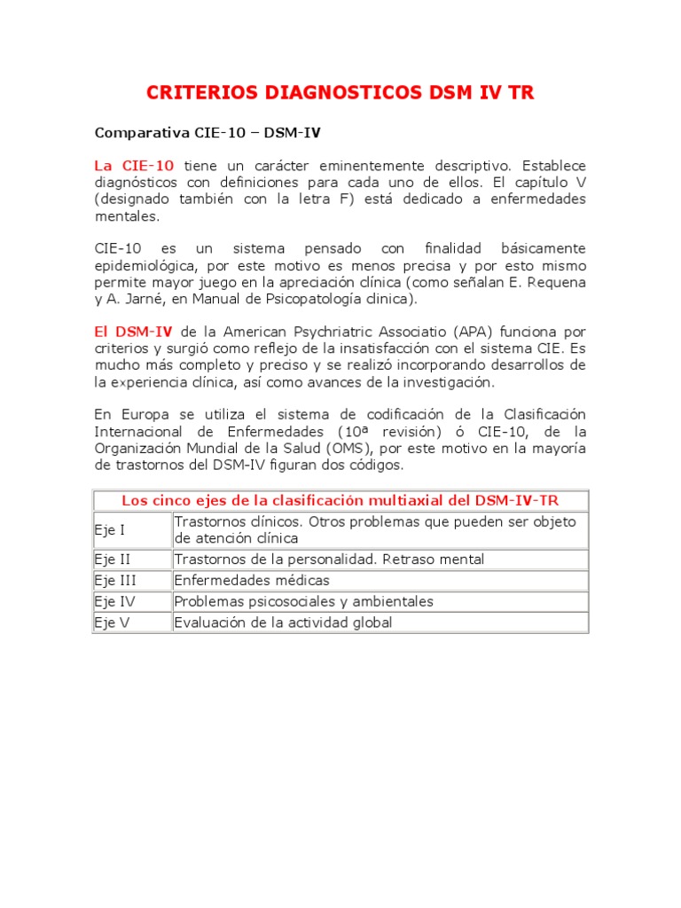 Comparativa CIE-10 DSM-IV La CIE-10 tiene un carcter eminentemente descriptivo. Establece diagnsticos con definiciones para cada uno de ellos. El captulo V (designado tambin con la letra F) est dedicado a enfermedades mentales. CIE-10 es un sistema pensado con finalidad bsicamente epidemiolgica, por este motivo es menos precisa y por esto mismo permite mayor juego en la apreciacin clnica (como sealan E. Requena y A. Jarn, en Manual de Psicopatologa clinica). El DSM-IV de la American Psychriatric Associatio (APA) funciona por criterios y surgi como reflejo de la insatisfaccin con el sistema CIE. Es mucho ms completo y preciso y se realiz incorporando desarrollos de la experiencia clnica, as como avances de la investigacin. En Europa se utiliza el sistema de codificacin de la Clasificacin Internacional de Enfermedades (10 revisin) CIE-10, de la Organizacin Mundial de la Salud (OMS), por este motivo en la mayora de trastornos del DSM-IV figuran dos cdigos. Los cinco ejes de la clasificacin multiaxial del DSM-IV-TR Eje I Eje II Eje III Eje IV Eje V Trastornos clnicos. Otros problemas que pueden ser objeto de atencin clnica Trastornos de la personalidad. Retraso mental Enfermedades mdicas Problemas psicosociales y ambientales Evaluacin de la actividad global