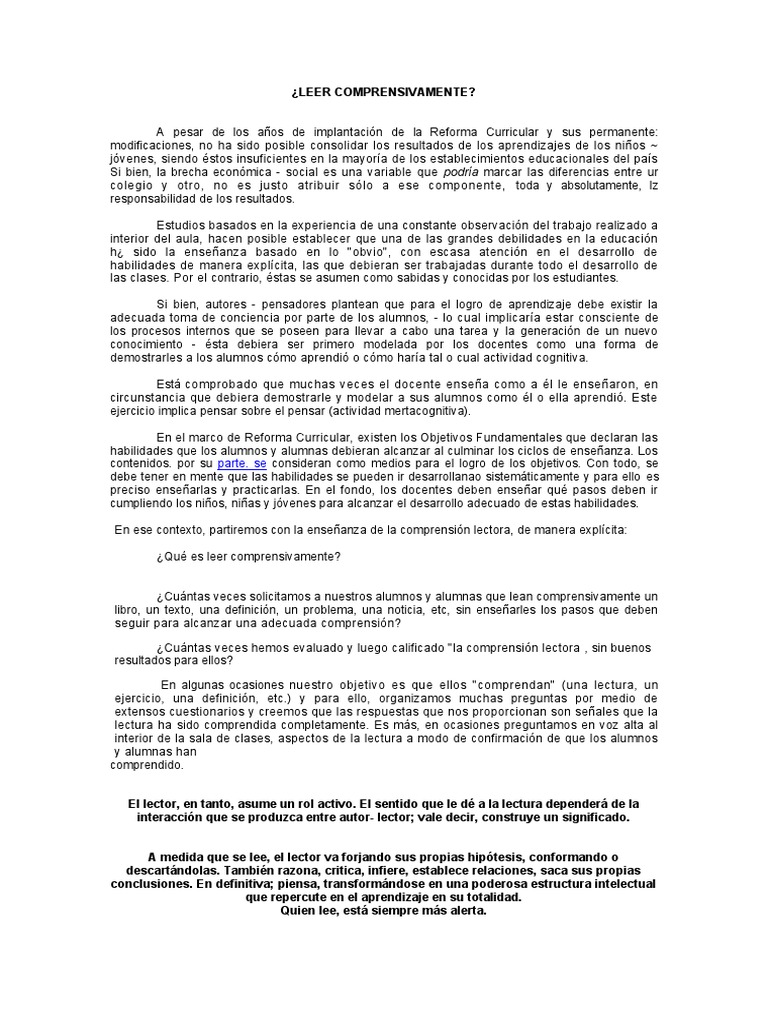 A pesar de los aos de implantacin de la Reforma Curricular y sus permanente: modificaciones, no ha sido posible consolidar los resultados de los aprendizajes de los nios ~ jvenes, siendo stos insuficientes en la mayora de los establecimientos educacionales del pas Si bien, la brecha econmica - social es una variable que podra marcar las diferencias entre ur colegio y otro, no es justo atribuir slo a ese componente, toda y absolutamente, Iz responsabilidad de los resultados. Estudios basados en la experiencia de una constante observacin del trabajo realizado a interior del aula, hacen posible establecer que una de las grandes debilidades en la educacin h sido la enseanza basado en lo "obvio", con escasa atencin en el desarrollo de habilidades de manera explcita, las que debieran ser trabajadas durante todo el desarrollo de las clases. Por el contrario, stas se asumen como sabidas y conocidas por los estudiantes. Si bien, autores - pensadores plantean que para el logro de aprendizaje debe existir la adecuada toma de conciencia por parte de los alumnos, - lo cual implicara estar consciente de los procesos internos que se poseen para llevar a cabo una tarea y la generacin de un nuevo conocimiento - sta debiera ser primero modelada por los docentes como una forma de demostrarles a los alumnos cmo aprendi o cmo hara tal o cual actividad cognitiva. Est comprobado que muchas veces el docente ensea como a l le ensearon, en circunstancia que debiera demostrarle y modelar a sus alumnos como l o ella aprendi. Este ejercicio implica pensar sobre el pensar (actividad mertacognitiva). En el marco de Reforma Curricular, existen los Objetivos Fundamentales que declaran las habilidades que los alumnos y alumnas debieran alcanzar al culminar los ciclos de enseanza. Los contenidos. por su parte. se consideran como medios para el logro de los objetivos. Con todo, se debe tener en mente que las habilidades se pueden ir desarrollanao sistemticamente y para ello es preciso ensearlas y practicarlas. En el fondo, los docentes deben ensear qu pasos deben ir cumpliendo los nios, nias y jvenes para alcanzar el desarrollo adecuado de estas habilidades. En ese contexto, partiremos con la enseanza de la comprensin lectora, de manera explcita: Qu es leer comprensivamente? Cuntas veces solicitamos a nuestros alumnos y alumnas que lean comprensivamente un libro, un texto, una definicin, un problema, una noticia, etc, sin ensearles los pasos que deben seguir para alcanzar una adecuada comprensin? Cuntas veces hemos evaluado y luego calificado "la comprensin lectora , sin buenos resultados para ellos? En algunas ocasiones nuestro objetivo es que ellos "comprendan" (una lectura, un ejercicio, una definicin, etc.) y para ello, organizamos muchas preguntas por medio de extensos cuestionarios y creemos que las respuestas que nos proporcionan son seales que la lectura ha sido comprendida completamente. Es ms, en ocasiones preguntamos en voz alta al interior de la sala de clases, aspectos de la lectura a modo de confirmacin de que los alumnos y alumnas han comprendido. El lector, en tanto, asume un rol activo. El sentido que le d a la lectura depender de la interaccin que se produzca entre autor- lector; vale decir, construye un significado. A medida que se lee, el lector va forjando sus propias hiptesis, conformando o descartndolas. Tambin razona, critica, infiere, establece relaciones, saca sus propias conclusiones. En definitiva; piensa, transformndose en una poderosa estructura intelectual que repercute en el aprendizaje en su totalidad. Quien lee, est siempre ms alerta.