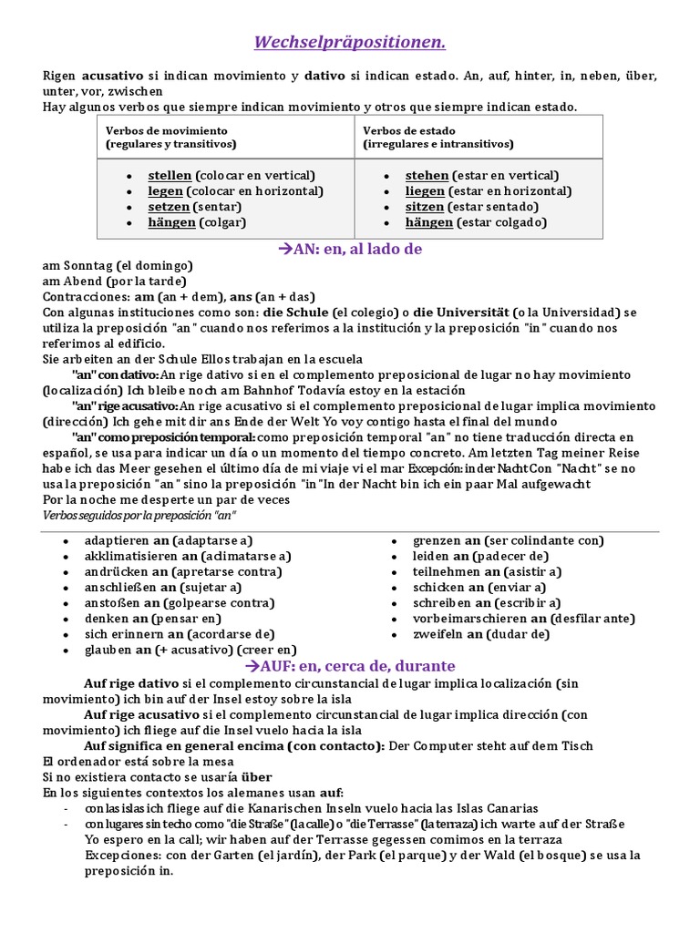 Rigen acusativo si indican movimiento y dativo si indican estado. An, auf, hinter, in, neben, ber, unter, vor, zwischen Hay algunos verbos que siempre indican movimiento y otros que siempre indican estado.