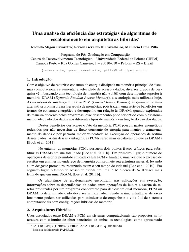 Com o objetivo de reduzir o consumo de energia dissipada na memoria´ principal de siste- mas computacionais e aumentar a velocidade de acesso a dados, diversos grupos de pes- quisa vemˆ buscando uma tecnologia de memoria´ nao-vol˜ atil´ com desempenho superior a` memoria´ DRAM (Dynamic Random-Access Memory), a tecnologia mais utilizada hoje. As memorias´ de mudanc¸a de fase – PCM (Phase-Change Memory) surgiram como uma alternativa promissora na hierarquia de memorias,´ pois trazem uma serie´ de benef´ıcios em termos de consumo energetico´ e desempenho em relac¸ao˜ as` DRAMs quando exploradas de maneira eficiente pelos programas, esse desempenho pode ser obtido com o escalona- mento adequado dos dados nos diferentes tipos de memoria´ em func¸ao˜ do uso dos dados.