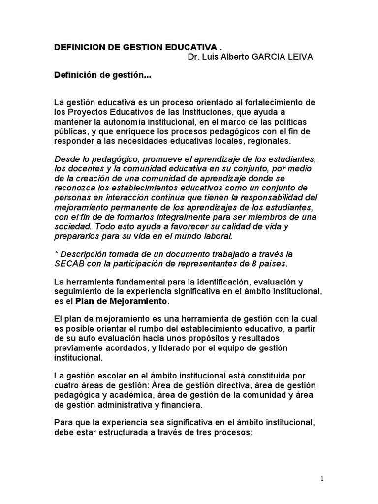 DEFINICION DE GESTION EDUCATIVA . Dr. Luis Alberto GARCIA LEIVA Definicin de gestin...