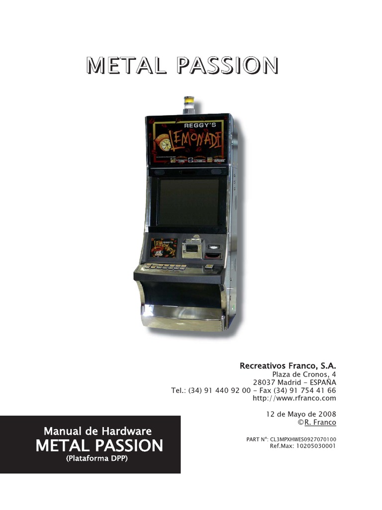 El presente manual describe el hardware para la plataforma de la mquina recreativa METAL PASSION DPP de R. Franco. Se trata del documento de acompaamiento del Manual de Software. El presente manual proporciona la informacin tcnica sobre el hardware de la plataforma, y facilita al tcnico de la mquina de casino o ingeniero de campo la informacin necesaria para instalar, montar y configurar la plataforma. Este aparato no est destinado para ser usado por personas (incluidos nios) cuyas capacidades fsicas, sensoriales o mentales estn reducidas, o carezcan de experiencia o conocimento, salvo si han tenido supervisin o instrucciones relativas al uso del aparato por una persona responsable de su seguridad. Los nios deberan ser supervisados para asegurar que no juegan con el aparato El presente manual est organizado mediante el uso de una jerarqua de nmero de seccin que pretende facilitar la identificacin de la informacin fundamental. Tambin se incluyen en el presente manual los hipervnculos internos de este documento.