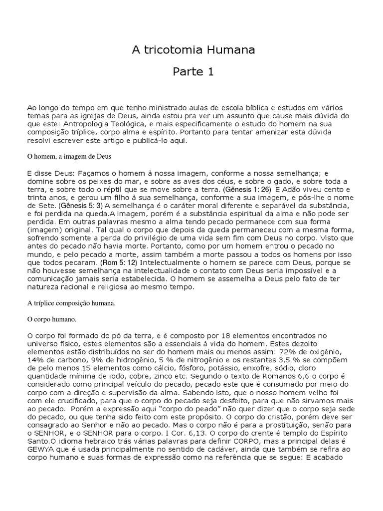 Ao longo do tempo em que tenho ministrado aulas de escola bblica e estudos em vrios temas para as igrejas de Deus, ainda estou pra ver um assunto que cause mais dvida do que este: Antropologia Teolgica, e mais especificamente o estudo do homem na sua composio trplice, corpo alma e esprito. Portanto para tentar amenizar esta dvida resolvi escrever este artigo e public-lo aqui. O homem, a imagem de Deus E disse Deus: Faamos o homem nossa imagem, conforme a nossa semelhana; e domine sobre os peixes do mar, e sobre as aves dos cus, e sobre o gado, e sobre toda a terra, e sobre todo o rptil que se move sobre a terra. (Gnesis 1: 26) E Ado viveu cento e trinta anos, e gerou um filho sua semelhana, conforme a sua imagem, e ps-lhe o nome de Sete. (Gnesis 5: 3) A semelhana o carter moral diferente e separvel da substncia, e foi perdida na queda.A imagem, porm a substncia espiritual da alma e no pode ser perdida. Em outras palavras mesmo a alma tendo pecado permanece com sua forma (imagem) original. Tal qual o corpo que depois da queda permaneceu com a mesma forma, sofrendo somente a perda do privilgio de uma vida sem fim com Deus no corpo. Visto que antes do pecado no havia morte. Portanto, como por um homem entrou o pecado no mundo, e pelo pecado a morte, assim tambm a morte passou a todos os homens por isso que todos pecaram. (Rom 5: 12) Intelectualmente o homem se parece com Deus, porque se no houvesse semelhana na intelectualidade o contato com Deus seria impossvel e a comunicao jamais seria estabelecida. O homem se assemelha a Deus pelo fato de ter natureza racional e religiosa ao mesmo tempo. A trplice composio humana. O corpo humano. O corpo foi formado do p da terra, e composto por 18 elementos encontrados no universo fsico, estes elementos so a essenciais vida do homem. Estes dezoito elementos esto distribudos no ser do homem mais ou menos assim: 72% de oxignio, 14% de carbono, 9% de hidrognio, 5 % de nitrognio e os restantes 3,5 % se compem de pelo menos 15 elementos como clcio, fsforo, potssio, enxofre, sdio, cloro quantidade mnima de iodo, cobre, zinco etc. Segundo o texto de Romanos 6,6 o corpo considerado como principal veculo do pecado, pecado este que consumado por meio do corpo com a direo e superviso da alma. Sabendo isto, que o nosso homem velho foi com ele crucificado, para que o corpo do pecado seja desfeito, para que no sirvamos mais ao pecado. Porm a expresso aqui corpo do peado no quer dizer que o corpo seja sede do pecado, ou que tenha sido feito com este propsito. O corpo do cristo, porm deve ser consagrado ao Senhor e no ao pecado. Mas o corpo no para a prostituio, seno para o SENHOR, e o SENHOR para o corpo. I Cor. 6,13. O corpo do crente templo do Esprito Santo.O idioma hebraico trs vrias palavras para definir CORPO, mas a principal delas GEWYA que usada principalmente no sentido de cadver, ainda que tambm se refira ao corpo humano e suas formas de expresso como na referncia que se segue: E acabado