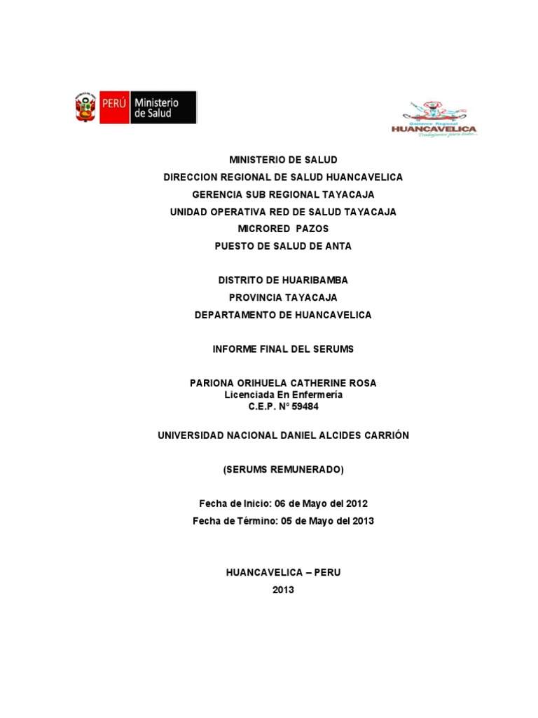 MICRORED PAZOS PUESTO DE SALUD DE ANTA DISTRITO DE HUARIBAMBA PROVINCIA TAYACAJA DEPARTAMENTO DE HUANCAVELICA INFORME FINAL DEL SERUMS PARIONA ORIHUELA CATHERINE ROSA Licenciada En Enfermera C.E.P. N 59484 UNIVERSIDAD NACIONAL DANIEL ALCIDES CARRIN (SERUMS REMUNERADO) Fecha de Inicio: 06 de Mayo del 2012 Fecha de Trmino: 05 de Mayo del 2013