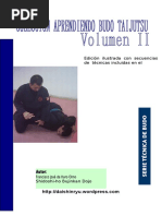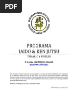 I. KIHON WAZA: TECNICAS FUNDAMENTALES 1. Posiciones (tachi waza) Posicin natural (Sizen tai) Posicin de combate (Fudo Dachi) Desplazamientos al frente en avance y retroceso. 2. Guardias (Kamae-kata) Guardia clsica. Guardia mixta. 3. Trabajo individual Tradicionalmente Uke est en guardia con las manos abiertas y los pies en la misma direccin Serie 1: Tai Sabaki 1. Tai Sabaki lateral izquierdo y despus derecho 2. Tai Sabaki adelante izquierdo y despus derecho 3. Tai Sabaki otras izquierdo y despus atrs derecho 4. Tai Sabaki circular izquierdo y despus derecho. Serie 2 Tai-Sabaki (dem con control con los brazos) Serie 3 Atemi 1. Tai Sabaki lateral izquierdo Mae Geri derecho 2. Tai Sabaki lateral derecho Mae Geri izquierdo 3. Tai Sabaki adelante izquierdo hizo ate o Me Uchi derecho 4. Tai Sabaki adelante derecho hizo ate o Me Uchi izquierdo 5. Tai Sabaki atrs izquierdo Mae Geri izquierdo (pie adelantado) 6. Tai Sabaki atrs derecho Mae gen izquierdo <pie adelantado> 7. Tai Sabaki circular izquierdo Empi Uchi izquierdo 8. Tai Sabaki circular derecho Empi Uchi derecho Serie 4 Ukemi (cadas) 1. adelante derecha e izquierda 2. cada adelante con guardia en el suelo 3. cada atrs blocando 4. cada atrs rodando derecha y izquierdo II. TECNICAS DE BASE: 1. Salidas por golpe: 2. Salidas por llave: 3. Salidas por proyeccin: III. KATA: 1. primer kata de atemi IV. 1. 2. 3. COMPLEMENTARIO Rei Dojo-Kun Te Hodoki el saludo los preceptos del Nihon Tai-Jitsu Salida de agarres de muecas. 1, 2, 3 y 4. 1, 2, 3 y 4. 1, 2, 3 y 4.