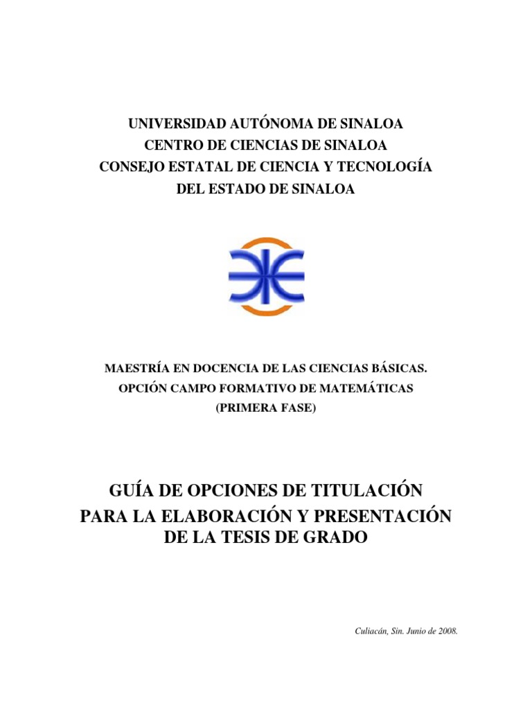 El Programa de MAESTRA EN DOCENCIA DE LAS CIENCIAS BSICAS, OPCIN CAMPO FORMATIVO DE MATEMTICAS establece tres diferentes opciones de titulacin, atendiendo a los intereses, esfuerzos previos y experiencias de los inscritos en l. En algunos casos hay pasos ya importantes en el desarrollo de una tesis, es decir, de una investigacin terico-metodolgica; en otros, por la naturaleza del tema y objeto de su inters, se ha avanzado en trminos del diseo de una propuesta de intervencin pedaggica, dimensin imprescindible de la matemtica educativa; en algunos ms, su ejercicio profesional les ha llevado a desarrollar experiencias educativas que por su consistencia metodolgica son dignas de recuperarse y analizarse a la luz de los resultados, tanto como de sus fundamentos. En otros casos se cuenta con amplia informacin y valiosas nociones tericas sin haber cruzado certeramente tales acciones hacia un objeto de estudio particular, mantenindose en un nivel de dispersin, aunque son potencialmente tiles para elaborar un documento de titulacin. De esta manera, las opciones para la titulacin que propone este programa son: Tesis de Investigacin Cientfica, Propuesta de Intervencin Educativa y Reporte Monogrfico de Experiencia Educativa. Para mayor claridad, las particularidades de cada opcin se presentan a continuacin. 1) Tesis de Investigacin Cientfica De acuerdo con el Reglamento de Investigacin y Posgrado que rige a la Universidad Autnoma de Sinaloa, institucin que otorgar el grado correspondiente a este Programa de Maestra, se mantiene como opcin la elaboracin de tesis. Cabe aclarar que, independientemente de las opciones elegidas por los estudiantes para su titulacin y con la finalidad de sujetarse a dicha normatividad institucional, el documento formal de titulacin se concibe en todos los casos como TESIS DE GRADO, y as deber consignarse en la portada y voto aprobatorio de los miembros del jurado acadmico.
