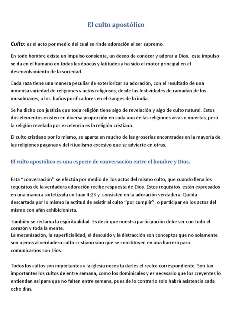 En todo hombre existe un impulso consiente, un deseo de conocer y adorar a Dios. este impulso se da en el humano en todas las pocas y latitudes y ha sido el motor principal en el desenvolvimiento de la sociedad. Cada raza tiene una manera peculiar de exteriorizar su adoracin, con el resultado de una inmensa variedad de religiones y actos religiosos, desde las festividades de ramadn de los musulmanes, a los baos purificadores en el Ganges de la india. Se ha dicho con justicia que toda religin tiene algo de revelacin y algo de culto natural. Estos dos elementos existen en diversa proporcin en cada una de las religiones vivas o muertas, pero la religin revelada por excelencia es la religin cristiana. El culto cristiano por lo mismo, se aparta en mucho de las groseras encontradas en la mayora de las religiones paganas y del ritualismo excesivo que se advierte en otras. El culto apostlico es una especie de conversacin entre el hombre y Dios. Esta conversacin se efecta por medio de los actos del mismo culto, que cuando llena los requisitos de la verdadera adoracin recibe respuesta de Dios. Estos requisitos estn expresados en una manera sintetizada en Juan 4:23 y consisten en la adoracin verdadera. Queda descartada por lo mismo la actitud de asistir al culto por cumplir, o participar en los actos del mismo con afn exhibicionista. Tambin se reclama la espiritualidad. Es decir que nuestra participacin debe ser con todo el corazn y toda la mente. La mecanizacin, la superficialidad, el descuido y la distraccin son conceptos que no solamente son ajenos al verdadero culto cristiano sino que se constituyen en una barrera para comunicarnos con Dios. Todos los cultos son importantes y la iglesia necesita darles el realce correspondiente. Son tan importantes los cultos de entre semana, como los dominicales y es necesario que los creyentes lo entiendan as para que no falten entre semana, pues de lo contrario solo habr asistencia cada ocho das.