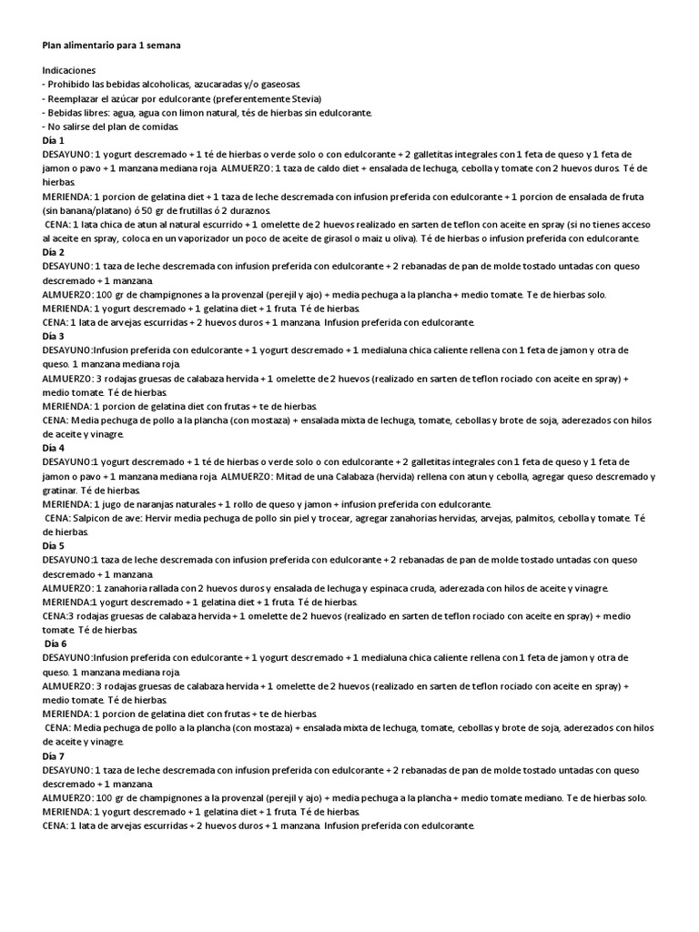 - Reemplazar el azcar por edulcorante (preferentemente Stevia) - Bebidas libres: agua, agua con limon natural, ts de hierbas sin edulcorante. - No salirse del plan de comidas. Da 1 DESAYUNO: 1 yogurt descremado + 1 t de hierbas o verde solo o con edulcorante + 2 galletitas integrales con 1 feta de queso y 1 feta de jamon o pavo + 1 manzana mediana roja. ALMUERZO: 1 taza de caldo diet + ensalada de lechuga, cebolla y tomate con 2 huevos duros. T de hierbas. MERIENDA: 1 porcion de gelatina diet + 1 taza de leche descremada con infusion preferida con edulcorante + 1 porcion de ensalada de fruta (sin banana/platano) 50 gr de frutillas 2 duraznos. CENA: 1 lata chica de atun al natural escurrido + 1 omelette de 2 huevos realizado en sarten de teflon con aceite en spray (si no tienes acceso al aceite en spray, coloca en un vaporizador un poco de aceite de girasol o maiz u oliva). T de hierbas o infusion preferida con edulcorante. Da 2 DESAYUNO: 1 taza de leche descremada con infusion preferida con edulcorante + 2 rebanadas de pan de molde tostado untadas con queso descremado + 1 manzana. ALMUERZO: 100 gr de champignones a la provenzal (perejil y ajo) + media pechuga a la plancha + medio tomate. Te de hierbas solo. MERIENDA: 1 yogurt descremado + 1 gelatina diet + 1 fruta. T de hierbas. CENA: 1 lata de arvejas escurridas + 2 huevos duros + 1 manzana. Infusion preferida con edulcorante. Da 3 DESAYUNO:Infusion preferida con edulcorante + 1 yogurt descremado + 1 medialuna chica caliente rellena con 1 feta de jamon y otra de queso. 1 manzana mediana roja. ALMUERZO: 3 rodajas gruesas de calabaza hervida + 1 omelette de 2 huevos (realizado en sarten de teflon rociado con aceite en spray) + medio tomate. T de hierbas. MERIENDA: 1 porcion de gelatina diet con frutas + te de hierbas. CENA: Media pechuga de pollo a la plancha (con mostaza) + ensalada mixta de lechuga, tomate, cebollas y brote de soja, aderezados con hilos de aceite y vinagre. Da 4 DESAYUNO:1 yogurt descremado + 1 t de hierbas o verde solo o con edulcorante + 2 galletitas integrales con 1 feta de queso y 1 feta de jamon o pavo + 1 manzana mediana roja. ALMUERZO: Mitad de una Calabaza (hervida) rellena con atun y cebolla, agregar queso descremado y gratinar. T de hierbas. MERIENDA: 1 jugo de naranjas naturales + 1 rollo de queso y jamon + infusion preferida con edulcorante. CENA: Salpicon de ave: Hervir media pechuga de pollo sin piel y trocear, agregar zanahorias hervidas, arvejas, palmitos, cebolla y tomate. T de hierbas. Da 5 DESAYUNO:1 taza de leche descremada con infusion preferida con edulcorante + 2 rebanadas de pan de molde tostado untadas con queso descremado + 1 manzana. ALMUERZO: 1 zanahoria rallada con 2 huevos duros y ensalada de lechuga y espinaca cruda, aderezada con hilos de aceite y vinagre. MERIENDA:1 yogurt descremado + 1 gelatina diet + 1 fruta. T de hierbas. CENA:3 rodajas gruesas de calabaza hervida + 1 omelette de 2 huevos (realizado en sarten de teflon rociado con aceite en spray) + medio tomate. T de hierbas. Da 6 DESAYUNO:Infusion preferida con edulcorante + 1 yogurt descremado + 1 medialuna chica caliente rellena con 1 feta de jamon y otra de queso. 1 manzana mediana roja. ALMUERZO: 3 rodajas gruesas de calabaza hervida + 1 omelette de 2 huevos (realizado en sarten de teflon rociado con aceite en spray) + medio tomate. T de hierbas. MERIENDA: 1 porcion de gelatina diet con frutas + te de hierbas. CENA: Media pechuga de pollo a la plancha (con mostaza) + ensalada mixta de lechuga, tomate, cebollas y brote de soja, aderezados con hilos de aceite y vinagre. Da 7 DESAYUNO: 1 taza de leche descremada con infusion preferida con edulcorante + 2 rebanadas de pan de molde tostado untadas con queso descremado + 1 manzana. ALMUERZO: 100 gr de champignones a la provenzal (perejil y ajo) + media pechuga a la plancha + medio tomate mediano. Te de hierbas solo. MERIENDA: 1 yogurt descremado + 1 gelatina diet + 1 fruta. T de hierbas. CENA: 1 lata de arvejas escurridas + 2 huevos duros + 1 manzana. Infusion preferida con edulcorante.
