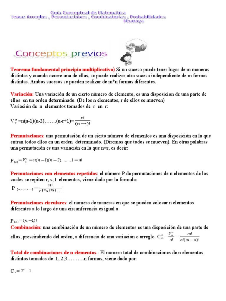 realizar otro suceso independiente de m formas distintas. Ambos sucesos se pueden realizar de m*n formas diferentes. Variacin: Una variacin de un cierto nmero de elemento, es una disposicion de una parte de ellos en un orden determinado. (De los n elementos, r de ellos se mueven) Variacin de n elementos tomados de r en r: Vn r =n(n-1)(n-2).(n-r+1)= ( n r )! Permutaciones: una permutacin de un cierto nmero de elementos es una disposicin en la que entran todos ellos en un orden determinado. (Diremos que todos se mueven). En otras palabras una permutacin es una variacin en la que n=r, es decir: P ( n ) = Vn