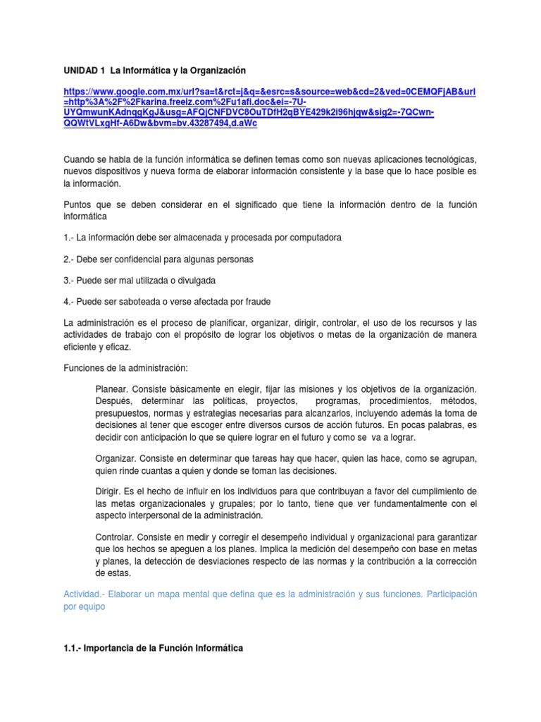 Cuando se habla de la funcin informtica se definen temas como son nuevas aplicaciones tecnolgicas, nuevos dispositivos y nueva forma de elaborar informacin consistente y la base que lo hace posible es la informacin. Puntos que se deben considerar en el significado que tiene la informacin dentro de la funcin informtica 1.- La informacin debe ser almacenada y procesada por computadora 2.- Debe ser confidencial para algunas personas 3.- Puede ser mal utilizada o divulgada 4.- Puede ser saboteada o verse afectada por fraude La administracin es el proceso de planificar, organizar, dirigir, controlar, el uso de los recursos y las actividades de trabajo con el propsito de lograr los objetivos o metas de la organizacin de manera eficiente y eficaz. Funciones de la administracin: Planear. Consiste bsicamente en elegir, fijar las misiones y los objetivos de la organizacin. Despus, determinar las polticas, proyectos, programas, procedimientos, mtodos, presupuestos, normas y estrategias necesarias para alcanzarlos, incluyendo adems la toma de decisiones al tener que escoger entre diversos cursos de accin futuros. En pocas palabras, es decidir con anticipacin lo que se quiere lograr en el futuro y como se va a lograr. Organizar. Consiste en determinar que tareas hay que hacer, quien las hace, como se agrupan, quien rinde cuantas a quien y donde se toman las decisiones. Dirigir. Es el hecho de influir en los individuos para que contribuyan a favor del cumplimiento de las metas organizacionales y grupales; por lo tanto, tiene que ver fundamentalmente con el aspecto interpersonal de la administracin. Controlar. Consiste en medir y corregir el desempeo individual y organizacional para garantizar que los hechos se apeguen a los planes. Implica la medicin del desempeo con base en metas y planes, la deteccin de desviaciones respecto de las normas y la contribucin a la correccin de estas. Actividad.- Elaborar un mapa mental que defina que es la administracin y sus funciones. Participacin por equipo