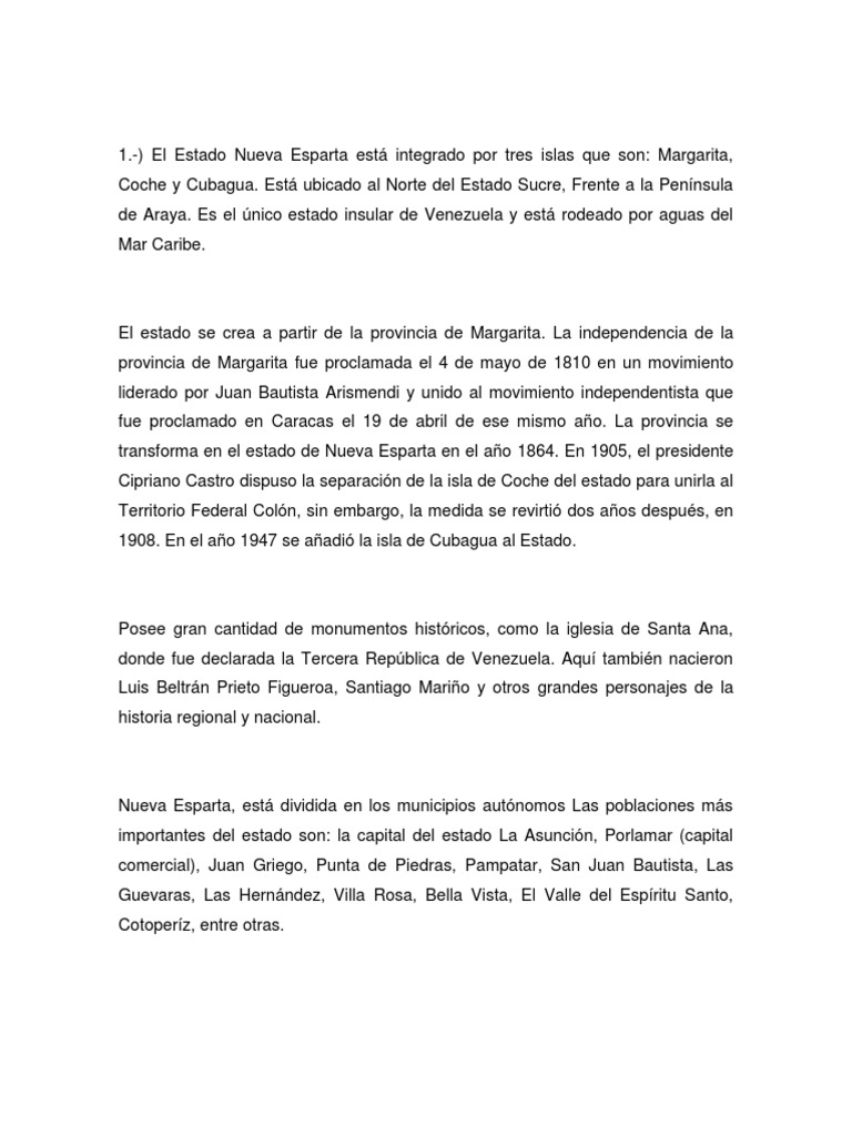 1.-) El Estado Nueva Esparta est integrado por tres islas que son: Margarita, Coche y Cubagua.