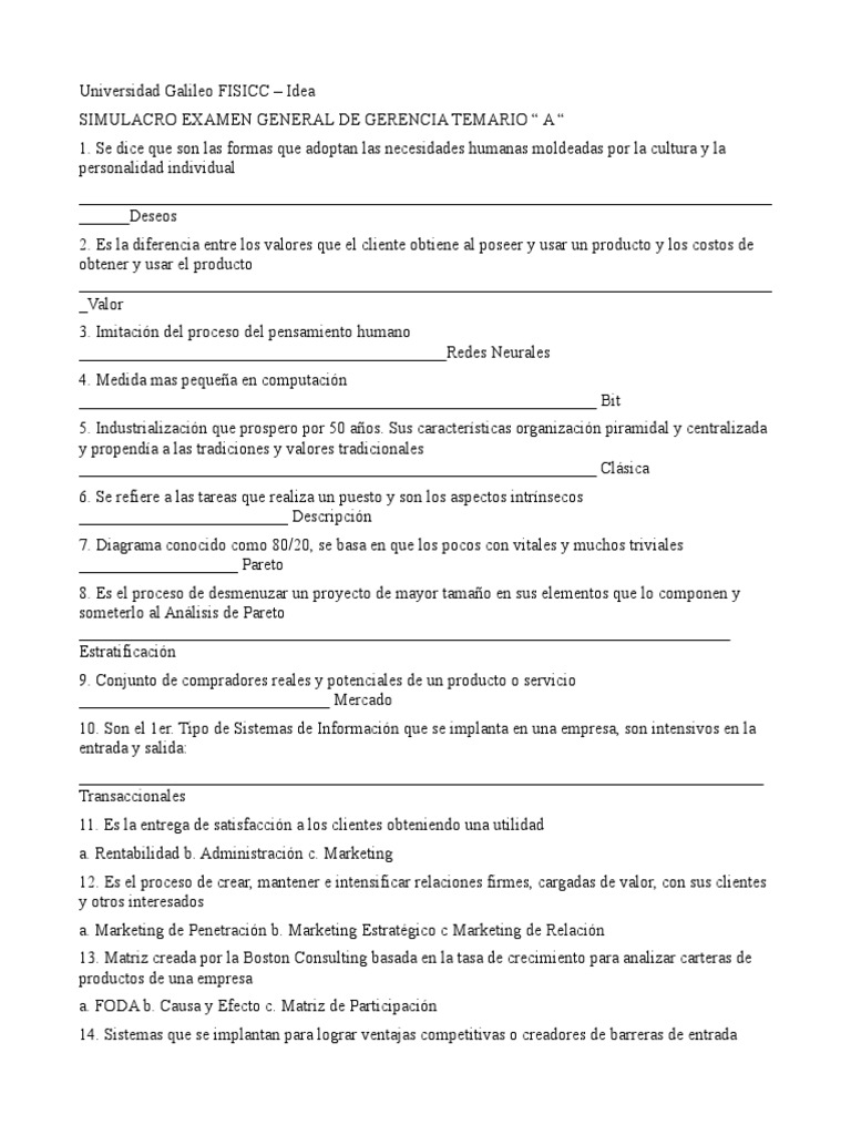 1. Se dice que son las formas que adoptan las necesidades humanas moldeadas por la cultura y la personalidad individual ___________________________________________________________________________________ ______Deseos 2. Es la diferencia entre los valores que el cliente obtiene al poseer y usar un producto y los costos de obtener y usar el producto ___________________________________________________________________________________ _Valor 3. Imitacin del proceso del pensamiento humano ____________________________________________Redes Neurales 4. Medida mas pequea en computacin ______________________________________________________________ Bit 5. Industrializacin que prospero por 50 aos. Sus caractersticas organizacin piramidal y centralizada y propenda a las tradiciones y valores tradicionales ______________________________________________________________ Clsica 6. Se refiere a las tareas que realiza un puesto y son los aspectos intrnsecos _________________________ Descripcin 7. Diagrama conocido como 80/20, se basa en que los pocos con vitales y muchos triviales ___________________ Pareto 8. Es el proceso de desmenuzar un proyecto de mayor tamao en sus elementos que lo componen y someterlo al Anlisis de Pareto ______________________________________________________________________________ Estratificacin 9. Conjunto de compradores reales y potenciales de un producto o servicio ______________________________ Mercado 10. Son el 1er. Tipo de Sistemas de Informacin que se implanta en una empresa, son intensivos en la entrada y salida: __________________________________________________________________________________ Transaccionales 11. Es la entrega de satisfaccin a los clientes obteniendo una utilidad a. Rentabilidad b. Administracin c. Marketing 12. Es el proceso de crear, mantener e intensificar relaciones firmes, cargadas de valor, con sus clientes y otros interesados a. Marketing de Penetracin b. Marketing Estratgico c Marketing de Relacin 13. Matriz creada por la Boston Consulting basada en la tasa de crecimiento para analizar carteras de productos de una empresa a. FODA b. Causa y Efecto c. Matriz de Participacin 14. Sistemas que se implantan para lograr ventajas competitivas o creadores de barreras de entrada