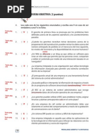 a. Transaccionales b. Estratgicos c. Especiales 15. Cable que se utiliza en la comunicacin de datos en distancias cortas menores a 15 Kms. a. Fibra ptica b. Coaxial c. Cobre 16. Es el rea en la que deben residir todos los programas y datos antes antes de que puedan ejecutar o manipularse a. Memoria Cach b. Memoria ROM c. Memoria RAM 17. Elemento de almacenamiento de informacin que contiene una serie de registros a. Datos b. Archivos c. Memoria 18. Es la ciencia que estudia de manera sistemtica el comportamiento inteligente, con el fin de imitar o simular las habilidades humanas mediante la creacin y uso de maquinas y computadoras a. Inteligencia Virtual b. Inteligencia Artificial c. Sistemas Expertos 19. Sistemas que se desarrollan en las organizaciones con el fin de lograr ventajas competitivas, a travs del uso de tecnologas de informacin a. Expertos b. Ejecutivos c. Estratgicos 20. Existen 2 tipo de memoria principal, la RAM y la a. REM b. RIM c. ROM 21. Las necesidades de seguridad son a. Primarias b. Secundarias c. Terciarias 22. En su sentido mas estricto significa volver comn a una o varias personas determinada informacin a. Transmitir b. Comunicar c. Delegar 23. Teora que estipula que la productividad es mas una cuestin de administracin de personas que de tecnologa, de filosofa y cultura organizacional que de enfoques tradicionales basados en la organizacin a. Teora X b. Teora Y c. Teora Z 24. Tcnica de ARH aplicada indirectamente a personas a. Entrevista b. Base de Datos c. Capacitacin 25. Es la escogencia de los candidatos a las posiciones vacantes a. Reclutamiento b. Contratacin c. Seleccin 26. Enfoque amplio y situacional, en este modelo hay varios candidatos para varias vacantes a. Seleccin b. Clasificacin c. Contratacin 27. Es el concepto que se fundamenta en las nociones de tarea, atribucin y funcin a. Certeza b. Mejoramiento Contnuo c. Cargo 28. Tipo de liderazgo que impone y espera cumplimiento de su voluntad a. Autocrtico b. Democrtico c. Liberal 29. Cualquier cosa que se pueda ofrecer en un mercado para satisfacer un deseo o una necesidad a. Demanda b. Producto c. Satisfactor