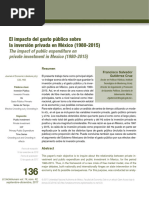 acervo de capital pblico generado por los flujos de inversin pblica. Asimismo, los beneficios de la produccin privada tambin son generados por el uso de dicho acervo. Sin embargo, Arrow y Kurz suponen que toda la inversin pblica es productiva, por lo cual no es necesario hacer una distincin entre gasto pblico productivo y no productivo, y dado que formulan un modelo neoclsico de crecimiento, dicho gasto pblico slo afecta la tasa de crecimiento transicional de la economa mientras la tasa de crecimiento en estado estacionario permanece inalterada. Con la aparicin y desarrollo de la teora del crecimiento endgeno (Romer, 1986, y Lucas, 1988), se despert el inters por desarrollar modelos en los que se vinculara el gasto pblico con la tasa de crecimiento de largo plazo de una economa. A este respecto, Barro (1990), continuando con lo presentado por Aschauer (1989a y c), introduce el concepto de gasto pblico productivo como un gasto que realiza el sector pblico en creacin de infraestructura econmica y que genera efectos en la produccin misma o en la productividad de los factores de la produccin, con la particularidad de que dicho gasto es complementario a la produccin privada, por lo cual lo incluyen como un argumento de la funcin produccin. Sin embargo, al igual que Arrow y Kurz para la inversin pblica, Barro y Aschauer suponen que todo el gasto pblico incluido dentro de la funcin produccin es productivo, encontrando evidencia emprica para una relacin positiva entre la inversin pblica (como expresin ntida del gasto pblico productivo utilizado por ambos autores) y el crecimiento del producto. Esto contrasta ampliamente con la tradicin neoclsica de considerar que la inversin pblica desplaza a la inversin privada, por lo cual se inhibe el crecimiento futuro y la productividad. Sin embargo, Devarajan y Zou (1994) observan que los efectos negativos, directos e indirectos, de la inversin pblica, en realidad son contrastantes, dependiendo de la forma en que se financie dicho gasto y de la estructura del sistema financiero. Ahora bien, la inclusin de la inversin pblica en particular o del gasto pblico productivo en general como un argumento de la funcin produccin, es posible en tanto que las inversiones en infraestructura econmica y/o social facilitan la implantacin y realizacin de los planes de inversin de los agentes privados, eliminando costos y barreras de transacciones y de capacitacin y educacin. Asimismo, la inversin pblica tambin tiene un efecto indirecto en la formacin de capital privado y por consiguiente en el crecimiento econmico, pero no slo por el aumento de la demanda agregada en bienes y servicios produ-