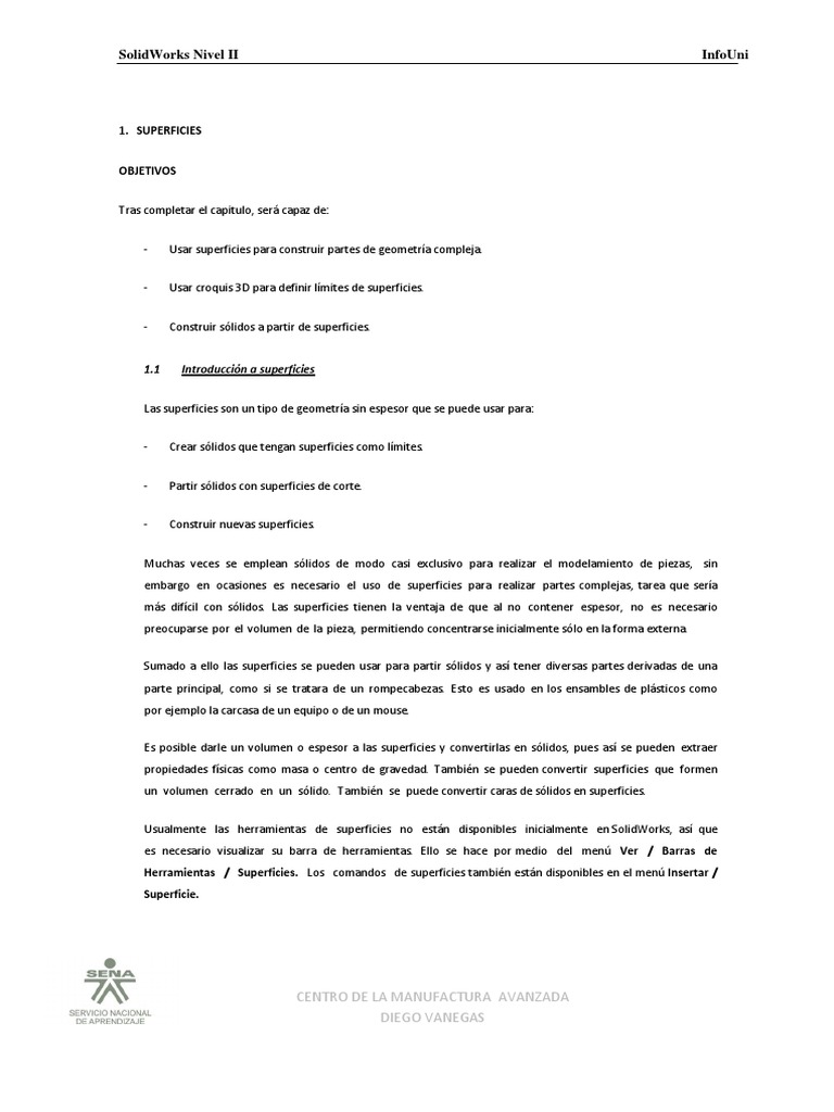 1. SUPERFICIES OBJETIVOS Tras completar el capitulo, ser capaz de: Usar superficies para construir partes de geometra compleja. Usar croquis 3D para definir lmites de superficies. Construir slidos a partir de superficies.