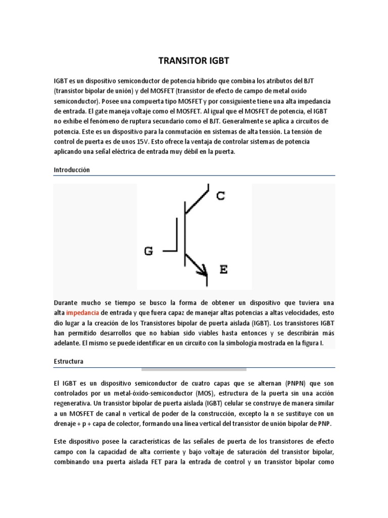 IGBT es un dispositivo semiconductor de potencia hbrido que combina los atributos del BJT (transistor bipolar de unin) y del MOSFET (transistor de efecto de campo de metal oxido semiconductor). Posee una compuerta tipo MOSFET y por consiguiente tiene una alta impedancia de entrada. El gate maneja voltaje como el MOSFET. Al igual que el MOSFET de potencia, el IGBT no exhibe el fenmeno de ruptura secundario como el BJT. Generalmente se aplica a circuitos de potencia. Este es un dispositivo para la conmutacin en sistemas de alta tensin. La tensin de control de puerta es de unos 15V. Esto ofrece la ventaja de controlar sistemas de potencia aplicando una seal elctrica de entrada muy dbil en la puerta. Introduccin