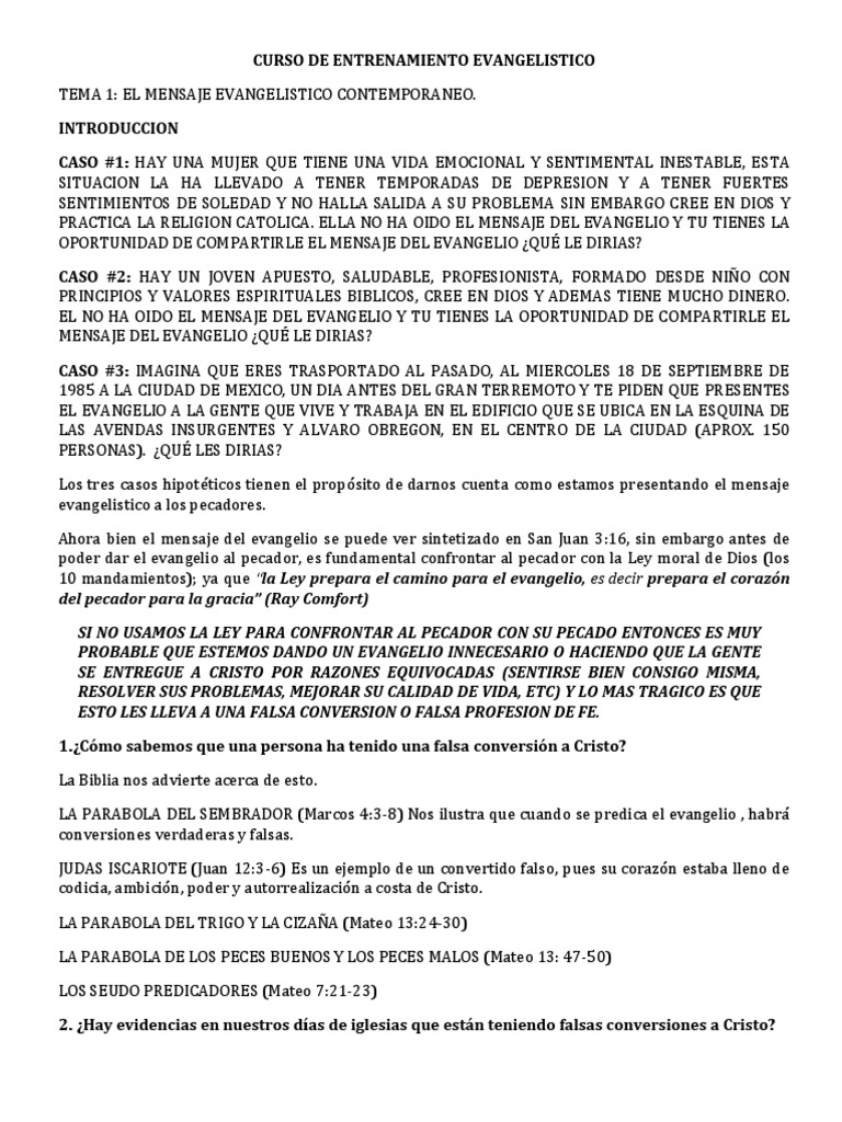 INTRODUCCION CASO #1: HAY UNA MUJER QUE TIENE UNA VIDA EMOCIONAL Y SENTIMENTAL INESTABLE, ESTA SITUACION LA HA LLEVADO A TENER TEMPORADAS DE DEPRESION Y A TENER FUERTES SENTIMIENTOS DE SOLEDAD Y NO HALLA SALIDA A SU PROBLEMA SIN EMBARGO CREE EN DIOS Y PRACTICA LA RELIGION CATOLICA. ELLA NO HA OIDO EL MENSAJE DEL EVANGELIO Y TU TIENES LA OPORTUNIDAD DE COMPARTIRLE EL MENSAJE DEL EVANGELIO QU LE DIRIAS? CASO #2: HAY UN JOVEN APUESTO, SALUDABLE, PROFESIONISTA, FORMADO DESDE NIO CON PRINCIPIOS Y VALORES ESPIRITUALES BIBLICOS, CREE EN DIOS Y ADEMAS TIENE MUCHO DINERO. EL NO HA OIDO EL MENSAJE DEL EVANGELIO Y TU TIENES LA OPORTUNIDAD DE COMPARTIRLE EL MENSAJE DEL EVANGELIO QU LE DIRIAS? CASO #3: IMAGINA QUE ERES TRASPORTADO AL PASADO, AL MIERCOLES 18 DE SEPTIEMBRE DE 1985 A LA CIUDAD DE MEXICO, UN DIA ANTES DEL GRAN TERREMOTO Y TE PIDEN QUE PRESENTES EL EVANGELIO A LA GENTE QUE VIVE Y TRABAJA EN EL EDIFICIO QUE SE UBICA EN LA ESQUINA DE LAS AVENDAS INSURGENTES Y ALVARO OBREGON, EN EL CENTRO DE LA CIUDAD (APROX. 150 PERSONAS). QU LES DIRIAS? Los tres casos hipotticos tienen el propsito de darnos cuenta como estamos presentando el mensaje evangelistico a los pecadores. Ahora bien el mensaje del evangelio se puede ver sintetizado en San Juan 3:16, sin embargo antes de poder dar el evangelio al pecador, es fundamental confrontar al pecador con la Ley moral de Dios (los 10 mandamientos); ya que la Ley prepara el camino para el evangelio, es decir prepara el corazn del pecador para la gracia (Ray Comfort) SI NO USAMOS LA LEY PARA CONFRONTAR AL PECADOR CON SU PECADO ENTONCES ES MUY PROBABLE QUE ESTEMOS DANDO UN EVANGELIO INNECESARIO O HACIENDO QUE LA GENTE SE ENTREGUE A CRISTO POR RAZONES EQUIVOCADAS (SENTIRSE BIEN CONSIGO MISMA, RESOLVER SUS PROBLEMAS, MEJORAR SU CALIDAD DE VIDA, ETC) Y LO MAS TRAGICO ES QUE ESTO LES LLEVA A UNA FALSA CONVERSION O FALSA PROFESION DE FE. [Link] sabemos que una persona ha tenido una falsa conversin a Cristo? La Biblia nos advierte acerca de esto. LA PARABOLA DEL SEMBRADOR (Marcos 4:3-8) Nos ilustra que cuando se predica el evangelio , habr conversiones verdaderas y falsas. JUDAS ISCARIOTE (Juan 12:3-6) Es un ejemplo de un convertido falso, pues su corazn estaba lleno de codicia, ambicin, poder y autorrealizacin a costa de Cristo. LA PARABOLA DEL TRIGO Y LA CIZAA (Mateo 13:24-30) LA PARABOLA DE LOS PECES BUENOS Y LOS PECES MALOS (Mateo 13: 47-50) LOS SEUDO PREDICADORES (Mateo 7:21-23) 2. Hay evidencias en nuestros das de iglesias que estn teniendo falsas conversiones a Cristo?