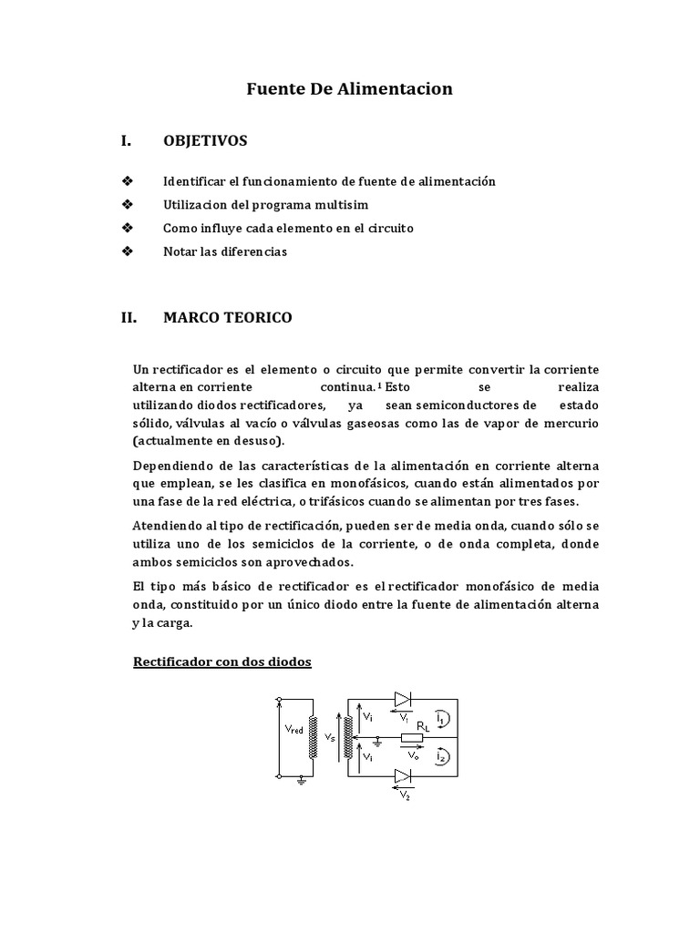 Los transformadores se utilizan para disminuir o elevar voltajes de corriente alterna. En nuestro caso para disminuir el voltaje. Los filtros, son de varios tipos y se utilizan para eliminar los componentes de C.A. no deseados. Los reguladores son un grupo de elementos, que se encarga que el voltaje de salida no vare de su valor nominal en cualquier condicin. La diferencia ms importante es que la tensin inversa que tienen que soportar los diodos es la mitad de la que tienen que soportar los diodos en un rectificador de onda completa con 2 diodos, con lo que se reduce el coste del circuito. Diodo son dispositivos que permiten el paso de la corriente elctrica en un solo sentido. Rectificador es un circuito que convierte la corriente en corriente continua, utilizando diodos rectificadores. Puente rectificador es un circuito formado por 4 diodos, configurados de tal forma que la corriente pase por los diodos 1 y 3 o 2 y 4, al entrar la corriente tiene forma senoidal y al salir es una onda completa. Rectificador con toma central se instala un transformador reductor de voltaje, con derivacin central. A la salida del transformador por su secundario, se ponen dos diodos como circuito rectificador.