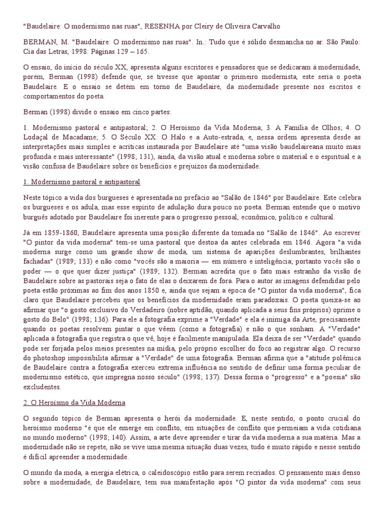 : Tudo que slido desmancha no ar. So Paulo: Cia das Letras, 1998. Pginas 129 165. O ensaio, do incio do sculo XX, apresenta alguns escritores e pensadores que se dedicaram modernidade, porm, Berman (1998) defende que, se tivesse que apontar o primeiro modernista, este seria o poeta Baudelaire. E o ensaio se detm em torno de Baudelaire, da modernidade presente nos escritos e comportamentos do poeta. Berman (1998) divide o ensaio em cinco partes: 1. Modernismo pastoral e antipastoral; 2. O Herosmo da Vida Moderna; 3. A Famlia de Olhos; 4. O Lodaal de Macadame; 5. O Sculo XX: O Halo e a Auto-estrada, e, nessa ordem apresenta desde as interpretaes mais simples e acrticas instaurada por Baudelaire at "uma viso baudelaireana muito mais profunda e mais interessante" (1998; 131), ainda, da viso atual e moderna sobre o material e o espiritual e a viso confusa de Baudelaire sobre os benefcios e prejuzos da modernidade. 1. Modernismo pastoral e antipastoral Neste tpico a vida dos burgueses apresentada no prefcio ao "Salo de 1846" por Baudelaire. Este celebra os burgueses e os adula, mas esse esprito de adulao dura pouco no poeta. Berman entende que o motivo burgus adotado por Baudelaire foi inerente para o progresso pessoal, econmico, poltico e cultural. J em 1859-1860, Baudelaire apresenta uma posio diferente da tomada no "Salo de 1846". Ao escrever "O pintor da vida moderna" tem-se uma pastoral que destoa da antes celebrada em 1846. Agora "a vida moderna surge como um grande show de moda, um sistema de aparies deslumbrantes, brilhantes fachadas" (1989; 133) e no como "vocs so a maioria em nmero e inteligncia; portanto vocs so o poder o que quer dizer justia" (1989; 132). Berman acredita que o fato mais estranho da viso de Baudelaire sobre as pastorais seja o fato de elas o deixarem de fora. Para o autor as imagens defendidas pelo poeta esto prximas ao fim dos anos 1850 e, ainda que sejam a poca de "O pintor da vida moderna", fica claro que Baudelaire percebeu que os benefcios da modernidade eram paradoxais. O poeta queixa-se ao afirmar que "o gosto exclusivo do Verdadeiro (nobre aptido, quando aplicada a seus fins prprios) oprime o gosto do Belo" (1998; 136). Para ele a fotografia exprime a "Verdade" e ela inimiga da Arte, precisamente quando os poetas resolvem pintar o que vem (como a fotografia) e no o que sonham. A "Verdade" aplicada fotografia que registra o que v, hoje facilmente manipulada. Ela deixa de ser "Verdade" quando pode ser forjada pelos meios presentes na mdia, pelo prprio escolher do foco ao registrar algo. O recurso do photoshop impossibilita afirmar a "Verdade" de uma fotografia. Berman afirma que a "atitude polmica de Baudelaire contra a fotografia exerceu extrema influncia no sentido de definir uma forma peculiar de modernismo esttico, que impregna nosso sculo" (1998; 137). Dessa forma o "progresso" e a "poesia" so excludentes. 2. O Herosmo da Vida Moderna O segundo tpico de Berman apresenta o heri da modernidade. E, neste sentido, o ponto crucial do herosmo moderno " que ele emerge em conflito, em situaes de conflito que permeiam a vida cotidiana no mundo moderno" (1998; 140). Assim, a arte deve apreender e tirar da vida moderna a sua matria. Mas a modernidade no se repete, no se vive uma mesma situao duas vezes, tudo muito rpido e nesse sentido difcil apreender a modernidade. O mundo da moda, a energia eltrica, o caleidoscpio esto para serem recriados. O pensamento mais denso sobre a modernidade, de Baudelaire, tem sua manifestao aps "O pintor da vida moderna" com seus