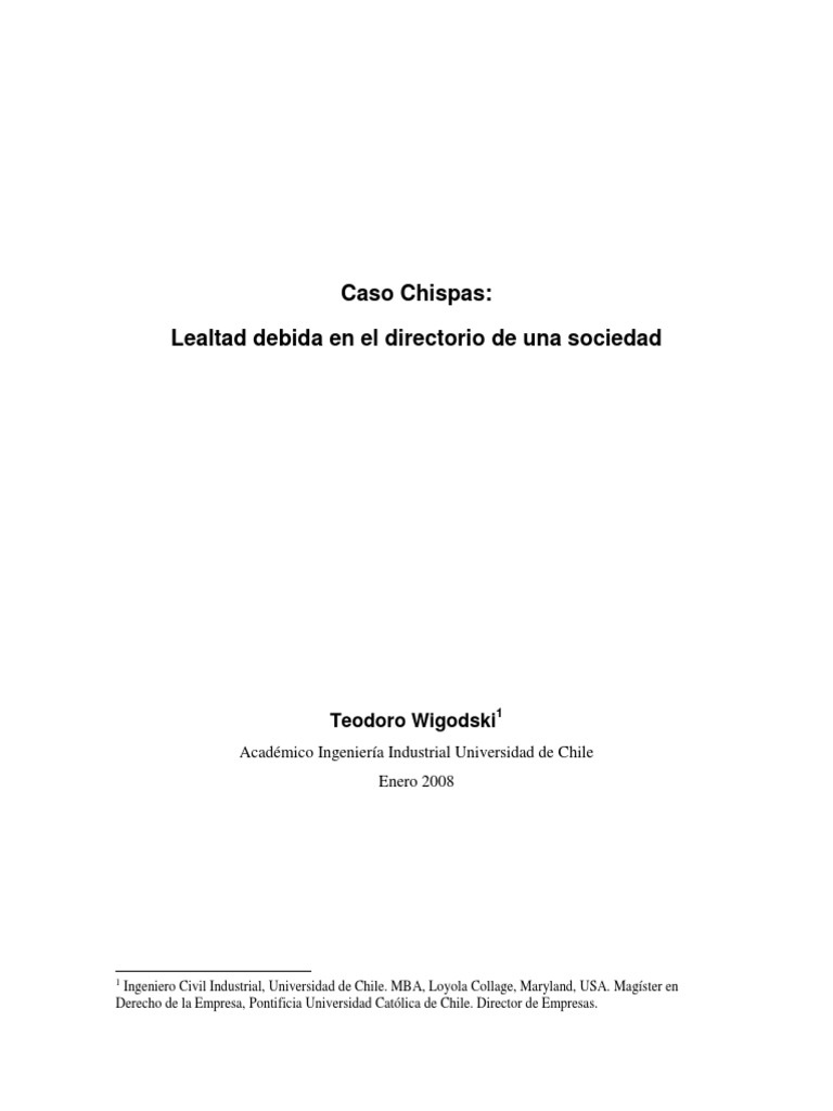Agradezco a los alumnos del curso: Gobierno Corporativo, que realiz desde el ao 2000 en el Magister en Administracin de Empresas (MBA) del Departamento de Ingeniera Industrial de la Facultad de Ingeniera de la Universidad de Chile, que estimulan la investigacin de casos nacionales para reforzar su experiencia de aprendizaje. En particular a los investigadores que me apoyaron en el estudio del caso Chispas: los Ingenieros y MBA Sres. Guillermo Cartes y Franco Ziga