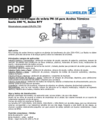 Presin de trabajo: Mximo 16 bar de 0 C hasta 120 C Mximo 13 bar de 0 C hasta 300 C Mximo 10 bar de 0 C hasta 320 C Valores intermedios son interpolables. Atencin: Presin de trabajo = Presin de aspiracin + Presin de la bomba a Caudal cero Presin de aspiracin mxima 5 bar. Para presiones de aspiracin superior consultar con el fabricante. Posicin de las bridas: Brida de aspiracin axial, brida de impulsin radial hacia arriba. Bridas: La ejecucin es deacuerdo a la norma ANSI B16, 5 C1, 150. Apoyo del eje: Un rodamiento radial lubricado con grasa, segn DIN 625 (el primer llenado de grasa se realiza en fbrica). Un cojinete liso lavado con lquido bombeado. Cierre del eje: Designacin 002, por juntas radiales sin refrigerar. Campo de temperatura: 0 C hasta 320 C.