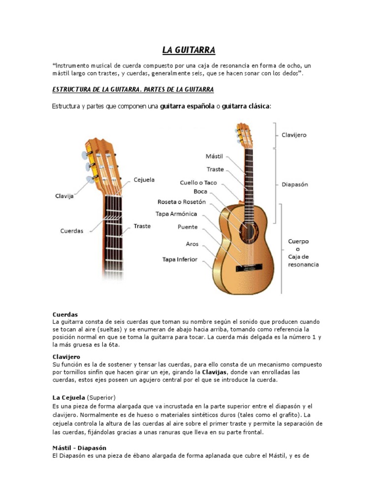 Cuerdas La guitarra consta de seis cuerdas que toman su nombre segn el sonido que producen cuando se tocan al aire (sueltas) y se enumeran de abajo hacia arriba, tomando como referencia la posicin normal en que se toma la guitarra para tocar. La cuerda ms delgada es la nmero 1 y la ms gruesa es la 6ta. Clavijero Su funcin es la de sostener y tensar las cuerdas, para ello consta de un mecanismo compuesto por tornillos sinfn que hacen girar un eje, girando la Clavijas, donde van enrolladas las cuerdas, estos ejes poseen un agujero central por el que se introduce la cuerda. La Cejuela (Superior) Es una pieza de forma alargada que va incrustada en la parte superior entre el diapasn y el clavijero. Normalmente es de hueso o materiales sintticos duros (tales como el grafito). La cejuela controla la altura de las cuerdas al aire sobre el primer traste y permite la separacin de las cuerdas, fijndolas gracias a unas ranuras que lleva en su parte frontal. Mstil - Diapasn El Diapasn es una pieza de bano alargada de forma aplanada que cubre el Mstil, y es de