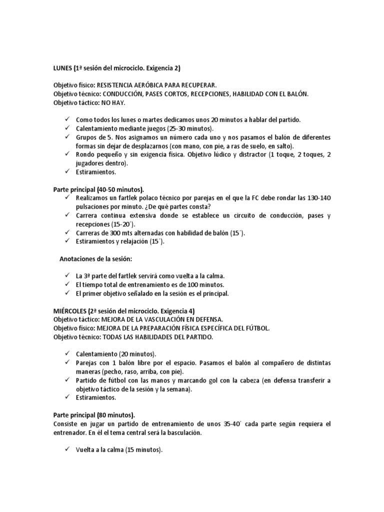 Objetivo tcnico: CONDUCCIN, PASES CORTOS, RECEPCIONES, HABILIDAD CON EL BALN. Objetivo tctico: NO HAY. Como todos los lunes o martes dedicamos unos 20 minutos a hablar del partido. Calentamiento mediante juegos (25-30 minutos). Grupos de 5. Nos asignamos un nmero cada uno y nos pasamos el baln de diferentes formas sin dejar de desplazarnos (con mano, con pie, a ras de suelo, en salto). Rondo pequeo y sin exigencia fsica. Objetivo ldico y distractor (1 toque, 2 toques, 2 jugadores dentro). Estiramientos. Parte principal (40-50 minutos). Realizamos un fartlek polaco tcnico por parejas en el que la FC debe rondar las 130-140 pulsaciones por minuto. De qu partes consta? Carrera continua extensiva donde se establece un circuito de conduccin, pases y recepciones (15-20). Carreras de 300 mts alternadas con habilidad de baln (15). Estiramientos y relajacin (15). Anotaciones de la sesin: La 3 parte del fartlek servir como vuelta a la calma. El tiempo total de entrenamiento es de 100 minutos. El primer objetivo sealado en la sesin es el principal. MIRCOLES (2 sesin del microciclo. Exigencia 4) Objetivo tctico: MEJORA DE LA VASCULACIN EN DEFENSA. Objetivo fsico: MEJORA DE LA PREPARACIN FSICA ESPECFICA DEL FTBOL. Objetivo tcnico: TODAS LAS HABILIDADES DEL PARTIDO. Calentamiento (20 minutos). Parejas con 1 baln libre por el espacio. Pasamos el baln al compaero de distintas maneras (pecho, raso, arriba, con pie). Partido de ftbol con las manos y marcando gol con la cabeza (en defensa transferir a objetivo tctico de la sesin y la semana). Estiramientos. Parte principal (80 minutos). Consiste en jugar un partido de entrenamiento de unos 35-40 cada parte segn requiera el entrenador. En l el tema central ser la basculacin. Vuelta a la calma (15 minutos).