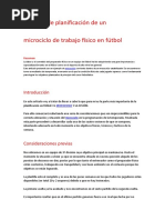 JUEVES (3 sesin del microciclo. Exigencia 3) Objetivo fsico: RESISTENCIA A LAS ACELERACIONES REPETIDAS. Objetivo tcnico: MEJORA DEL PASE, RECEPCIN Y CHUT. Objetivo tctico: MANTENER LA POSESIN DEL BALN Y MEJORAR LOS APOYOS. Calentamiento (25-30 minutos). Ftbol-tenis. Estiramientos. Parte Principal (60 minutos). 3x3 ms 2 porteros. En cada equipo hay un portero, 2 defensas y 1 delantero. Se trata de ejercicios de entre 20-30 segundos. Ambos equipos deben entregarse al mximo. Cuando el equipo atacante pase el centro del campo slo puede subir uno de los dos defensas y el delantero contrario no puede bajar. Adems hay 2 jugadores neutros que siempre atacan para que se formen en ataque un 4x2. La recuperacin se hace tocando el baln entre los componentes del equipo. Metodologa: 1 serie de 8 minutos alternando 20-30 segundos de trabajo con 30-40 segundos de descanso. En el centro del campo nos pasamos el baln por parejas. Cuando diga un nmero (1 2), el nmero correspondiente conduce el baln hacia meta e intenta marcar gol. El otro lo impide. Metodologa: 5 repeticiones con 1 minuto y medio de recuperacin entre cada una. En medio campo 4 centrocampistas y 1 delantero frente a 4 defensas y 1 portero. Atacamos y cada vez que chutemos o perdamos el baln hay que ir corriendo al 100% hasta el centro del campo y volver al sitio. En el centro del campo hay un baln y atacar aquel equipo cuyos componentes lleguen al centro y vuelvan antes. Metodologa: 3 repeticiones de 2 minutos con 4 minutos de recuperacin entre cada una. Es importante tener en cuenta que entre cada ejercicio de la parte principal descansaremos 5 minutos. Debido a que la exigencia es slo de grado 3 el siguiente ejercicio se centra en el objetivo tcnico y tctico de ocupar bien los espacios. Se trata de realizar centros desde la banda para que 2 delanteros entren a rematar y 1 centrocampista llegue a la cada. Vuelta a la calma (15 minutos). Incluimos carrera continua y estiramientos. VIERNES (4 sesin del microciclo. Exigencia 3) Objetivo fsico: VELOCIDAD DE ARRANCADA. Objetivo tcnico: PASES, CONDUCCIN, CHUT. Objetivo tctico: VASCULACIN DEFENSIVA.