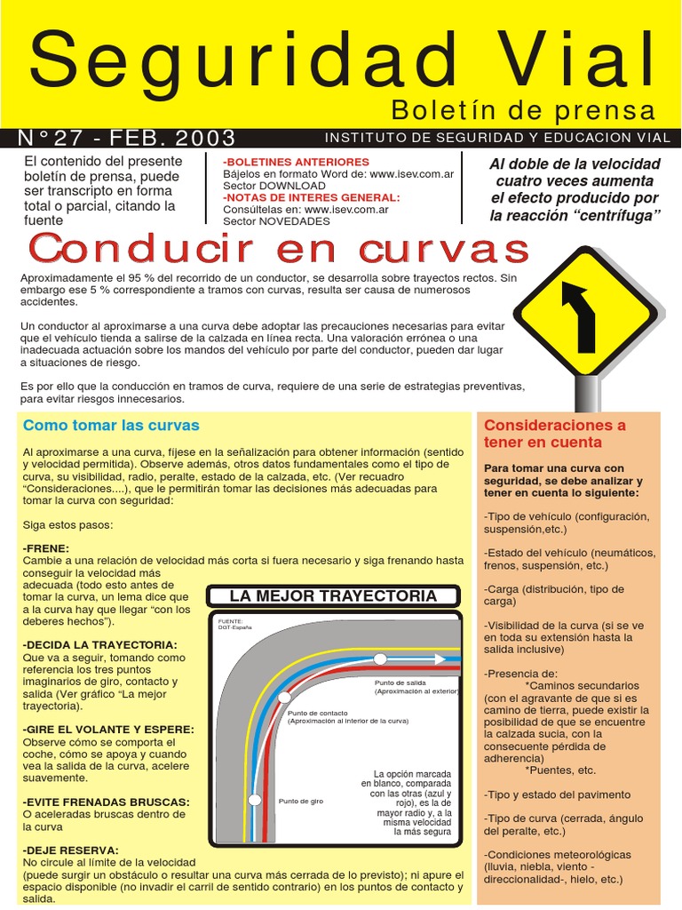 Aproximadamente el 95 % del recorrido de un conductor, se desarrolla sobre trayectos rectos. Sin embargo ese 5 % correspondiente a tramos con curvas, resulta ser causa de numerosos accidentes. Un conductor al aproximarse a una curva debe adoptar las precauciones necesarias para evitar que el vehculo tienda a salirse de la calzada en lnea recta. Una valoracin errnea o una inadecuada actuacin sobre los mandos del vehculo por parte del conductor, pueden dar lugar a situaciones de riesgo. Es por ello que la conduccin en tramos de curva, requiere de una serie de estrategias preventivas, para evitar riesgos innecesarios.