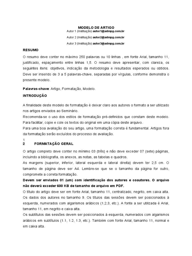 RESUMO O resumo deve conter no mximo 250 palavras ou 10 linhas , em fonte Arial, tamanho 11, justificado, espaamento entre linhas 1,5. O resumo deve apresentar, com clareza, os seguintes itens: objetivos, indicao da metodologia e resultados esperados ou obtidos. Deve ser inserido de 3 a 5 palavras-chave, separadas por vrgulas, conforme demonstra o presente modelo. Palavras-chave: Artigo, Formatao, Modelo. INTRODUO A finalidade deste modelo de formatao deixar claro aos autores o formato a ser utilizado nos artigos enviados ao Seminrio. Recomenda-se o uso dos estilos de formatao pr-definidos que constam deste modelo. Para facilitar, copie e cole os textos do original em uma cpia deste arquivo. Para uma boa avaliao do seu artigo, uma formatao correta fundamental. Artigos fora da formatao sero excludos do processo de avaliao. 1 2 FORMATAO GERAL