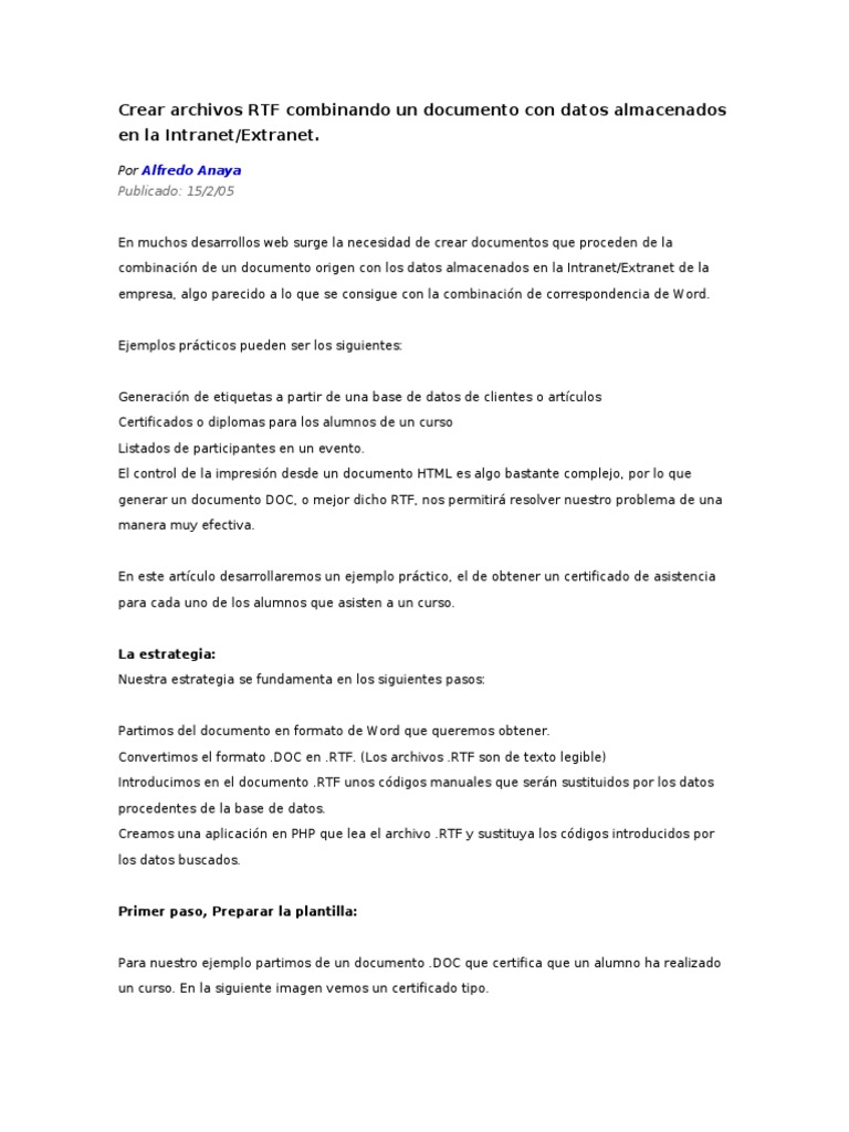 Partimos del documento en formato de Word que queremos obtener. Convertimos el formato .DOC en .RTF. (Los archivos .RTF son de texto legible) Introducimos en el documento .RTF unos cdigos manuales que sern sustituidos por los datos procedentes de la base de datos. Creamos una aplicacin en PHP que lea el archivo .RTF y sustituya los cdigos introducidos por los datos buscados.