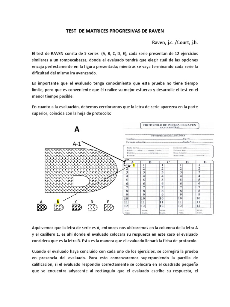 El test de RAVEN consta de 5 series (A, B, C, D, E), cada serie presentan de 12 ejercicios similares a un rompecabezas, donde el evaluado tendr que elegir cul de las opciones encaja perfectamente en la figura presentada; mientras se vaya terminando cada serie la dificultad del mismo ira avanzando. Es importante que el evaluado tenga conocimiento que esta prueba no tiene tiempo lmite, pero que es conveniente que l realice su mejor esfuerzo y desarrolle el test en el menor tiempo posible. En cuanto a la evaluacin, debemos cerciorarnos que la letra de serie aparezca en la parte superior, coincida con la hoja de protocolo: