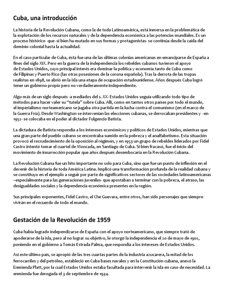 La historia de la Revolucin Cubana, como la de toda Latinoamrica, est inmersa en la problemtica de la explotacin de los recursos naturales y de la dependencia econmica a las potencias mundiales. Es un proceso histrico que -si bien ha mutado en sus formas y protagonistas- se contina desde la cada del dominio colonial hasta la actualidad. En el caso particular de Cuba, sta fue una de las ltimas colonias americanas en emanciparse de Espaa a fines del siglo XIX. Pero en la guerra de la independencia los rebeldes cubanos tuvieron el apoyo de Estados Unidos, cuyo principal inters era dominar la poltica y economa tanto de Cuba como de Filipinas y Puerto Rico (las otras posesiones de la corona espaola). Tras la derrota de las tropas realistas en 1898, se abri en la isla una etapa de ocupacin estadounidense. Aos despus Cuba logr tener un gobierno propio pero no verdaderamente independiente. Algo ms de un siglo despus -a mediados del s. XX- Estados Unidos segua utilizando todo tipo de mtodos para hacer valer su tutela sobre Cuba. All, como en tantos otros pases por todo el mundo, el imperialismo norteamericano se jugaba otra partida en la lucha contra el comunismo (en el marco de la Guerra Fra). Desde Washington se intervenan las elecciones cubanas, se derrocaban presidentes y -en 1952- se colocaba en el poder al dictador Fulgencio Batista. La dictadura de Batista responda a los intereses econmicos y polticos de Estados Unidos, mientras que una gran parte del pueblo cubano se encontraba sumido en la pobreza y el analfabetismo. Esta situacin provoc el recrudecimiento de la oposicin al rgimen, y en 1953 un grupo de rebeldes liderados por Fidel Castro intent tomar el cuartel de Moncada, en Santiago de Cuba. Si bien fracas, fue el inicio del movimiento de insurreccin popular que aos despus desembocara en la Revolucin Cubana. La Revolucin Cubana fue un hito importante no solo para Cuba, sino que fue un punto de inflexin en el devenir de la historia de toda Amrica Latina. Implic una transformacin profunda de la realidad cubana y se constituyo en el ejemplo a seguir por parte de significativos sectores de las sociedades latinoamericanas especialmente para las generaciones juveniles- que apostaban a terminar con la pobreza, el atraso, las desigualdades sociales y la dependencia econmica presentes en la regin. Sus principales exponentes, Fidel Castro, el Che Guevara, entre otros, han sido personajes que siempre vivirn en el recuerdo de todo el mundo.