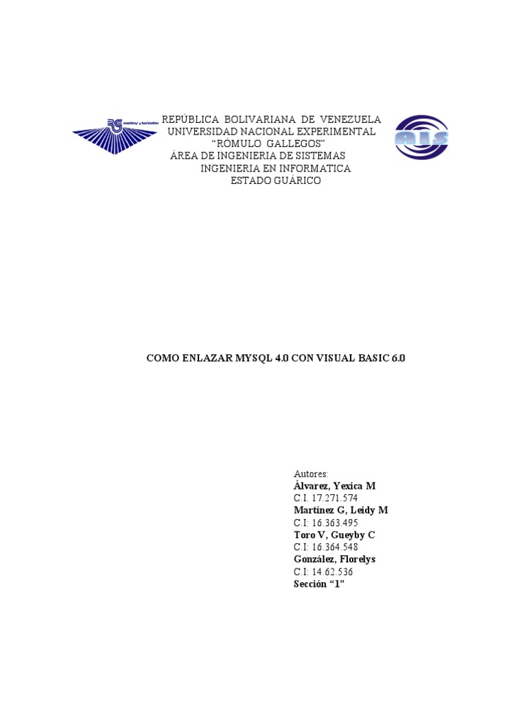 INTRODUCCIN Visual Basic es un lenguaje de programacin desarrollado por Alan Cooper para Microsoft. El lenguaje de programacin es un dialecto de BASIC, con importantes aadidos. Su primera versin fue presentada en 1991 con la intencin de simplificar la programacin utilizando un ambiente de desarrollo completamente grfico que facilitara la creacin de interfaces grficas y en cierta medida tambin la programacin misma. Es un lenguaje de fcil aprendizaje pensado tanto para programadores principiantes como expertos, guiado por eventos, y centrado en un motor de formularios que facilita el rpido desarrollo de aplicaciones grficas. Su sintaxis, derivada del antiguo BASIC, ha sido ampliada con el tiempo al agregarse las caractersticas tpicas de los lenguajes estructurados modernos. Se ha agregado una implementacin limitada de la programacin orientada a objetos (los propios formularios y controles son objetos), aunque s admite el polimorfismo mediante el uso de los Interfaces, no admite la herencia. No requiere de manejo de punteros y posee un manejo muy sencillo de cadenas de caracteres. Posee varias bibliotecas para manejo de bases de datos, pudiendo conectar con cualquier base de datos a travs de ODBC (Informix, DBase, Access, MySQL, SQL Server, PostgreSQL ,etc) a travs de ADO. Ahora bien, MySQL es un sistema gestor de bases de datos relacionales en SQL, esto significa que permite la gestin de los datos de una BBDD relacional usando un lenguaje de consulta estructurado. Y, por tanto, que a partir de una oracin, MySQL llevar a cabo una determinada accin sobre nuestra base de datos.