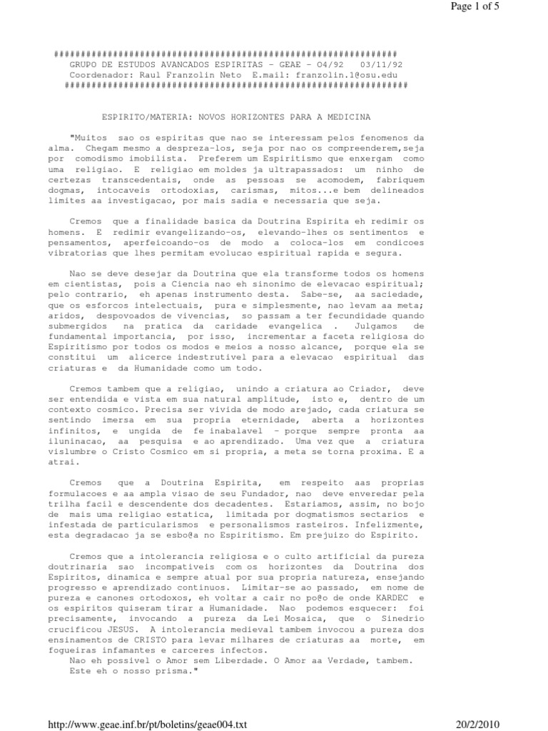 ################################################################ GRUPO DE ESTUDOS AVANCADOS ESPIRITAS - GEAE - O4/92 03/11/92 Coordenador: Raul Franzolin Neto E.mail: franzolin.1@osu.edu ################################################################