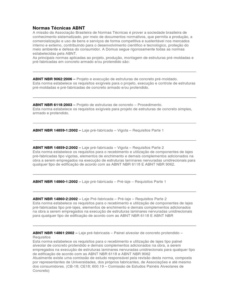A misso da Associao Brasileira de Normas Tcnicas prover a sociedade brasileira de conhecimento sistematizado, por meio de documentos normativos, que permita a produo, a comercializao e uso de bens e servios de forma competitiva e sustentvel nos mercados interno e externo, contribuindo para o desenvolvimento cientifico e tecnolgico, proteo do meio ambiente e defesa do consumidor. A Domus segue rigorosamente todas as normas estabelecidas pela ABNT. As principais normas aplicadas ao projeto, produo, montagem de estruturas pr-moldadas e pr-fabricadas em concreto armado e/ou protendido so: