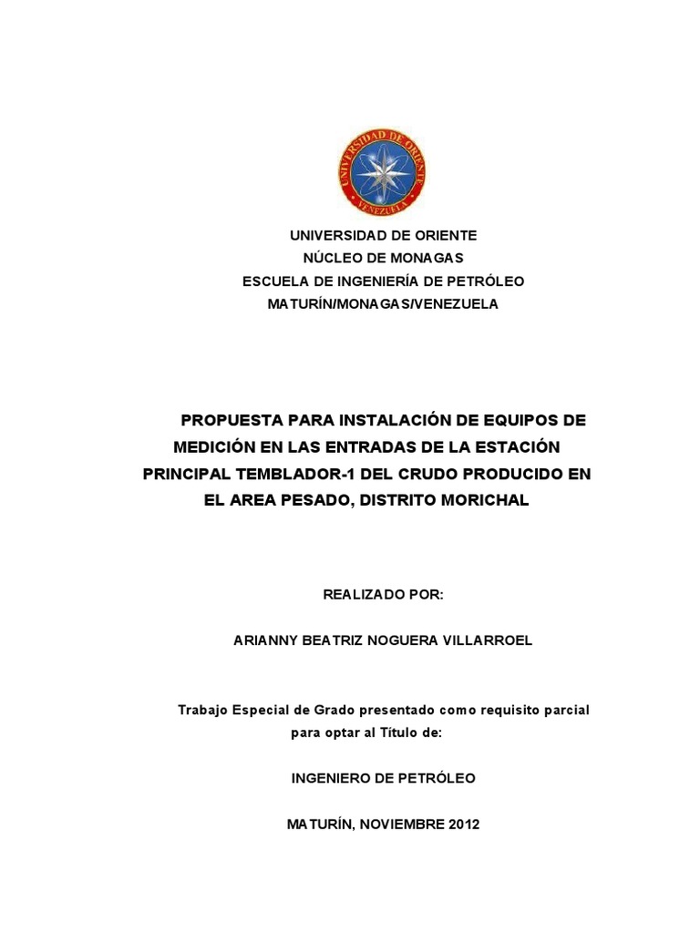 UNIVERSIDAD DE ORIENTE NCLEO DE MONAGAS ESCUELA DE INGENIERA DE PETRLEO MATURN/MONAGAS/VENEZUELA PROPUESTA PARA INSTALACIN DE EQUIPOS DE MEDICIN EN LAS ENTRADAS DE LA ESTACIN PRINCIPAL TEMBLADOR-1 DEL CRUDO PRODUCIDO EN EL AREA PESADO, DISTRITO MORICHAL AUTOR: Arianny Beatriz Noguera Villarroel C.I.:18.462.201 Septiembre; 2012 ASESOR ACADMICO: MSC. Carlos De La Cruz ASESOR INDUSTRIAL: Ing. Randolfo Verde