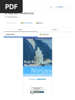 automasaje, con movimientos gimnsticos lentos, coordinados con la respiracin abdominal y, por supuesto, con la meditacin. La meditacin es un ejercicio interior desde una postura fija, una respiracin determinada, un "mantra" (palabras que vibran en el cuerpo y, al ser pronunciadas, incentivan los centros energticos) y un "mudra", posicin o entretejido de manos denominado Kuji In, con el cual se realizan nueve cortes en el aire o sobre la palma de la mano antes de entrar en trance; estos cortes son los Kuji Kiri (Kiri = corte, Ku = 9). Las tcnicas de meditacin y el uso de los Kuji Kiri estn reservados a los maestros, siendo prohibido su empleo para los alumnos, ya que al no comprenderlos cabalmente pueden caer en un mal uso, producindose, en consecuencia enfermedades y problemas psicolgicos. Por el contrario, con la gua del maestro consciente, esta prctica brinda un conocimiento superior (iluminacin) y posibilita el dominio de la esencia del hombre, como as tambin la develacin de los secretos ms profundos del mundo, Ninja. Tras esta breve introduccin veremos para qu se utilizan los 9 Kuji Kiri, sin mencionar el Mantra que les corresponde.