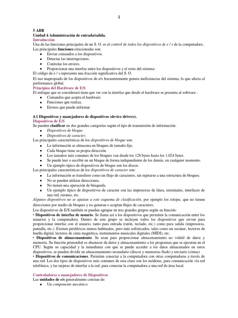 5 ABR Unidad 4 Administracin de entrada/salida. Introduccin Una de las funciones principales de un S. O. es el control de todos los dispositivos de e / s de la computadora . Las principales funciones relacionadas son: Enviar comandos a los dispositivos. Detectar las interrupciones. Controlar los errores. Proporcionar una interfaz entre los dispositivos y el resto del sistema: El cdigo de e / s representa una fraccin significativa del S. O. El uso inapropiado de los dispositivos de e/s frecuentemente genera ineficiencias del sistema, lo que afecta al performance global. Principios del Hardware de E/S El enfoque que se considerar tiene que ver con la interfaz que desde el hardware se presenta al software : Comandos que acepta el hardware. Funciones que realiza. Errores que puede informar. 4.1 Dispositivos y manejadores de dispositivos (device drivers). Dispositivos de E/S Se pueden clasificar en dos grandes categoras segn el tipo de transmisin de informacin: Dispositivos de bloque. Dispositivos de caracter. Las principales caractersticas de los dispositivos de bloque son: La informacin se almacena en bloques de tamao fijo. Cada bloque tiene su propia direccin. Los tamaos ms comunes de los bloques van desde los 128 bytes hasta los 1,024 bytes. Se puede leer o escribir en un bloque de forma independiente de los dems, en cualquier momento. Un ejemplo tpico de dispositivos de bloque son los discos. Las principales caractersticas de los dispositivos de caracter son: La informacin se transfiere como un flujo de caracteres, sin sujetarse a una estructura de bloques. No se pueden utilizar direcciones. No tienen una operacin de bsqueda. Un ejemplo tpico de dispositivos de caracter son las impresoras de lnea, terminales, interfaces de una red, ratones, etc. Algunos dispositivos no se ajustan a este esquema de clasificacin , por ejemplo los relojes, que no tienen direcciones por medio de bloques y no generan o aceptan flujos de caracteres. Los dispositivos de E/S tambin se pueden agrupar en tres grandes grupos segn su funcin: Dispositivos de interfaz de usuario. Se llama as a los dispositivos que permiten la comunicacin entre los usuarios y la computadora. Dentro de este grupo se incluyen todos los dispositivos que sirven para proporcionar interfaz con el usuario, tanto para entrada (ratn, teclado, etc.) como para salida (impresoras, pantalla, etc.). Existen perifricos menos habituales, pero ms sofisticados, tales como un escner, lectores de huella digital, lectores de cinta magntica, instrumentos musicales digitales (MIDI), etc. Dispositivos de almacenamiento. Se usan para proporcionar almacenamiento no voltil de datos y memoria. Su funcin primordial es abastecer de datos y almacenamiento a los programas que se ejecutan en el CPU. Segn su capacidad y la inmediatez con que se puede acceder a los datos almacenados en estos dispositivos, se pueden dividir en almacenamiento secundario (discos y memorias flash) y terciario (cintas) Dispositivos de comunicaciones. Permiten conectar a la computadora con otras computadoras a travs de una red. Los dos tipos de dispositivos ms comunes de esta clase son los mdems, para comunicacin va red telefnica, y las tarjetas de interfaz a la red, para conectar la computadora a una red de rea local. Controladores o manejadores de Dispositivos Las unidades de e/s generalmente constan de: Un componente mecnico.