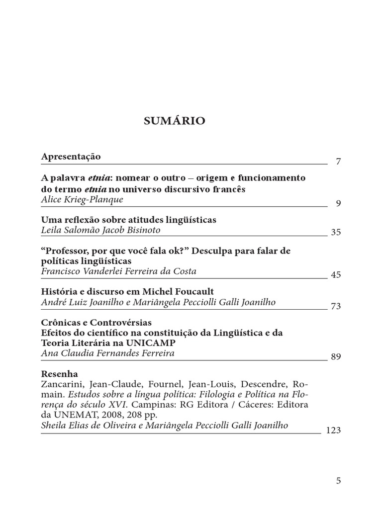 Apresentao A palavra etnia: nomear o outro origem e funcionamento do termo etnia no universo discursivo francs Alice Krieg-Planque Uma reflexo sobre atitudes lingsticas Leila Salomo Jacob Bisinoto Professor, por que voc fala ok? Desculpa para falar de polticas lingsticas Francisco Vanderlei Ferreira da Costa Histria e discurso em Michel Foucault Andr Luiz Joanilho e Maringela Pecciolli Galli Joanilho Crnicas e Controvrsias Efeitos do cientfico na constituio da Lingstica e da Teoria Literria na UNICAMP Ana Claudia Fernandes Ferreira Resenha Zancarini, Jean-Claude, Fournel, Jean-Louis, Descendre, Romain. Estudos sobre a lngua poltica: Filologia e Poltica na Florena do sculo XVI. Campinas: RG Editora / Cceres: Editora da UNEMAT, 2008, 208 pp. Sheila Elias de Oliveira e Maringela Pecciolli Galli Joanilho 7