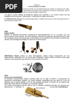 HISTORIA DEL MICROSCOPIO El microscopio fue inventado hacia los aos 1610, por Galileo Galilei, segn los italianos, o por Zacharias Janssen, en opinin de los holandeses. En 1628 aparece en la obra de William Harvey sobre la circulacin sangunea al observar al microscopio los capilares sanguneos y Robert Hooke publica su obra Micrographia. En 1665 Hooke observ con un microscopio un delgado corte de corcho y not que el material era poroso, en su conjunto, formaban cavidades poco profundas a modo de celditas a las que llam clulas. Se trataba de la primera observacin de clulas muertas. Unos aos ms tarde, Malpighi, anatomista y bilogo italiano, observ clulas vivas. Fue el primero en estudiar tejidos vivos al microscopio. A mediados del siglo XVII un holands, Anthony van Leeuwenhoek, utilizando microscopios simples de fabricacin propia, describi por primera vez protozoos, bacterias, espermatozoides y glbulos rojos. El microscopista Leeuwenhoek, sin ninguna preparacin cientfica, puede considerarse el fundador de la bacteriologa. Tallaba l mismo sus lupas sobre pequeas esferas de cristal, cuyos dimetros no alcanzaban el milmetro (su campo de visin era muy limitado, de dcimas de milmetro). Con estas pequeas distancias focales alcanzaba los 275 aumentos. Observ los glbulos de la sangre, las bacterias y los protozoos; examin por primera vez los glbulos rojos y descubri que el semen contiene espermatozoides. Durante su vida no revel sus mtodos secretos y a su muerte, en 1723, 26 de sus aparatos fueron cedidos a la Royal Society de Londres. Durante el siglo XVIII continu el progreso y se lograron objetivos acromticos por asociacin de vidrios flint y crown obtenidos en 1740 por H. M. Hall y mejorados por John Dollond. De esta poca son los estudios efectuados por Isaac Newton y Leonhard Euler. En el siglo XIX, al descubrirse que la dispersin y la refraccin se podan modificar con combinaciones adecuadas de dos o ms medios pticos, se lanzan al mercado objetivos acromticos excelentes. Durante el siglo XVIII el microscopio tuvo diversos adelantos mecnicos que aumentaron su estabilidad y su facilidad de uso, aunque no se desarrollaron por el momento mejoras pticas. Las mejoras ms importantes de la ptica surgieron en 1877, cuando Ernst Abbe public su teora del microscopio y, por encargo de Carl Zeiss, mejor la microscopa de inmersin sustituyendo el agua por aceite de cedro, lo que permite obtener aumentos de 2000. A principios de los aos 1930 se haba alcanzado el lmite terico para los microscopios pticos, no consiguiendo stos aumentos superiores a 500X o 1000X. 5