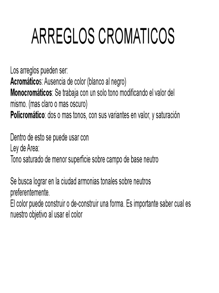 Los arreglos pueden ser: Acromticos: Ausencia de color (blanco al negro) Monocromticos: Se trabaja con un solo tono modificando el valor del mismo. (mas claro o mas oscuro) Policromtico: dos o mas tonos, con sus variantes en valor, y saturacin Dentro de esto se puede usar con Ley de Area: Tono saturado de menor superficie sobre campo de base neutro Se busca lograr en la ciudad armonias tonales sobre neutros preferentemente. El color puede construir o de-construir una forma. Es importante saber cual es nuestro objetivo al usar el color