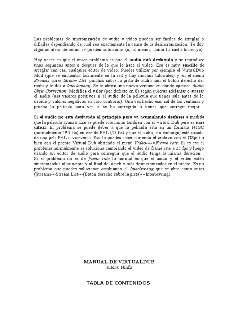 de la desincronizacin. Te doy algunas ideas de cmo se pueden solucionar (o, al menos, como lo suelo hacer yo). Hay veces en que el nico problema es que el audio est desfasado y se reproduce unos segundos antes o despus de lo que lo hace el vdeo. Eso es muy sencillo de arreglar con casi cualquier editor de vdeo. Puedes utilizar por ejemplo el VirtualDub Mod (que se encuentra fcilmente en la red y hay muchos tutoriales) y en el men Streams abres Stream List pinchas sobre la pista de audio con el botn derecho del ratn y le das a Interleaving. Se te abrir una nueva ventana en donde aparece Audio Skew Correction. Modifica el valor (por defecto en 0) segn quieras adelantar o atrasar el audio (usa valores positivos si el audio de la pelcula que tienes sale antes de lo debido y valores negativos en caso contrario). Una vez hecho eso, sal de las ventanas y prueba la pelcula para ver si se ha corregido o tienes que corregir mejor. Si el audio no est desfasado al principio pero va acumulando desfases a medida que la pelcula avanza. Eso se puede solucionar tambin con el Virtual Dub pero es ms difcil. El problema se puede deber a que la pelcula est en un formato NTSC (normalmente 29.9 fts) en vez de PAL (25 fts) y que el audio, sin embargo, est sacado de una peli PAL o viceversa. Eso lo puedes saber abriendo el archivo con el GSpot o bien con el propio Virtual Dub abriendo el men Video---->Frame rate. Si es ese el problema normalmente se soluciona cambiando el vdeo de frame rate a 25 fps y luego usando un editor de audio para conseguir que el audio tenga la misma duracin. Si el problema no es de frame rate lo normal es que el audio y el video estn sincronizados al principio y al final de la peli y ms desincronizados en el medio. Es un problema que puedes solucionar cambiando el Interleaving que se abre como antes (Streams---Stream List---(Botn derecho sobre la pista)---Interleaving).